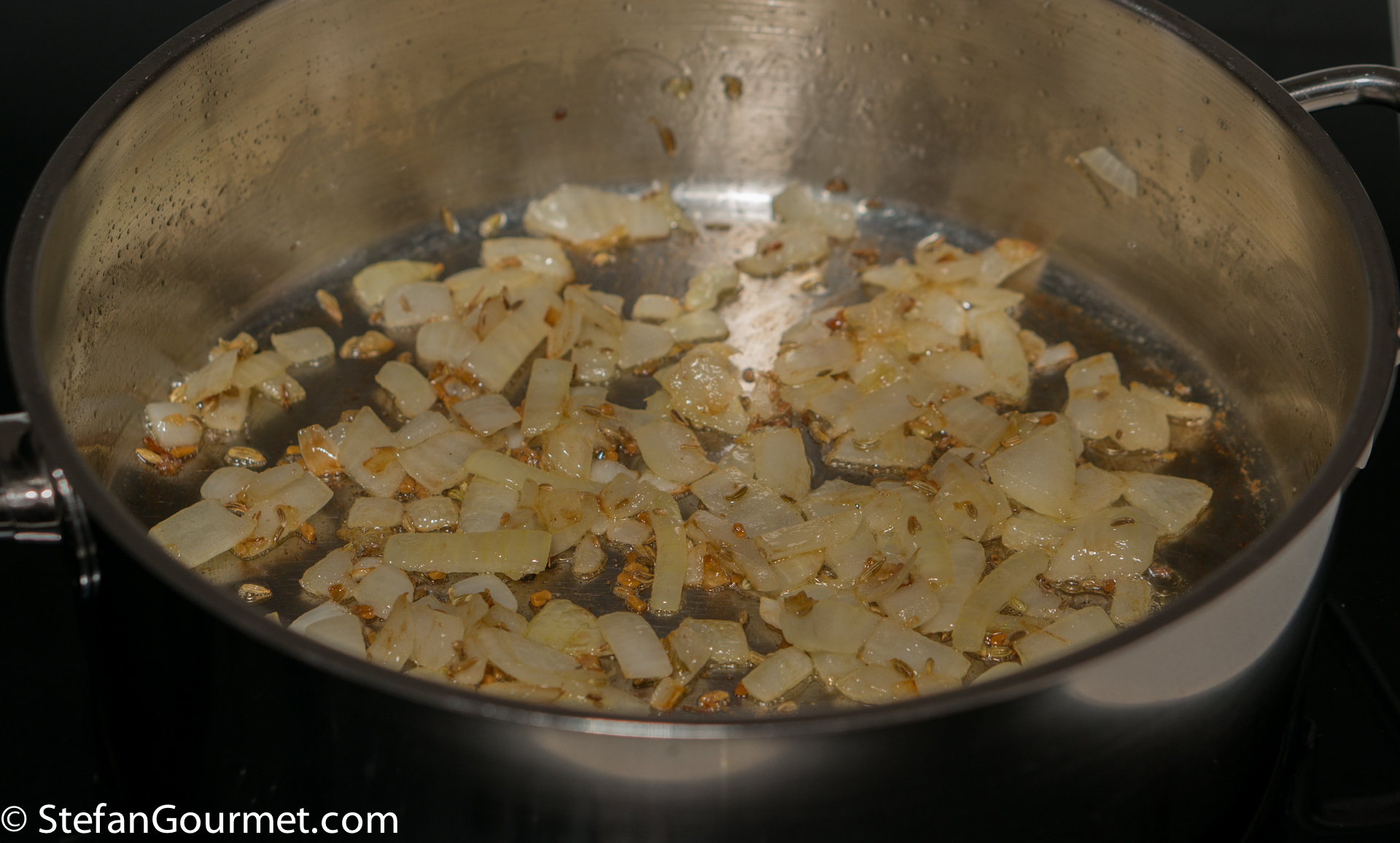 Heat 2 tablespoons of ghee in a frying pan and add a chopped onion. Season with salt.