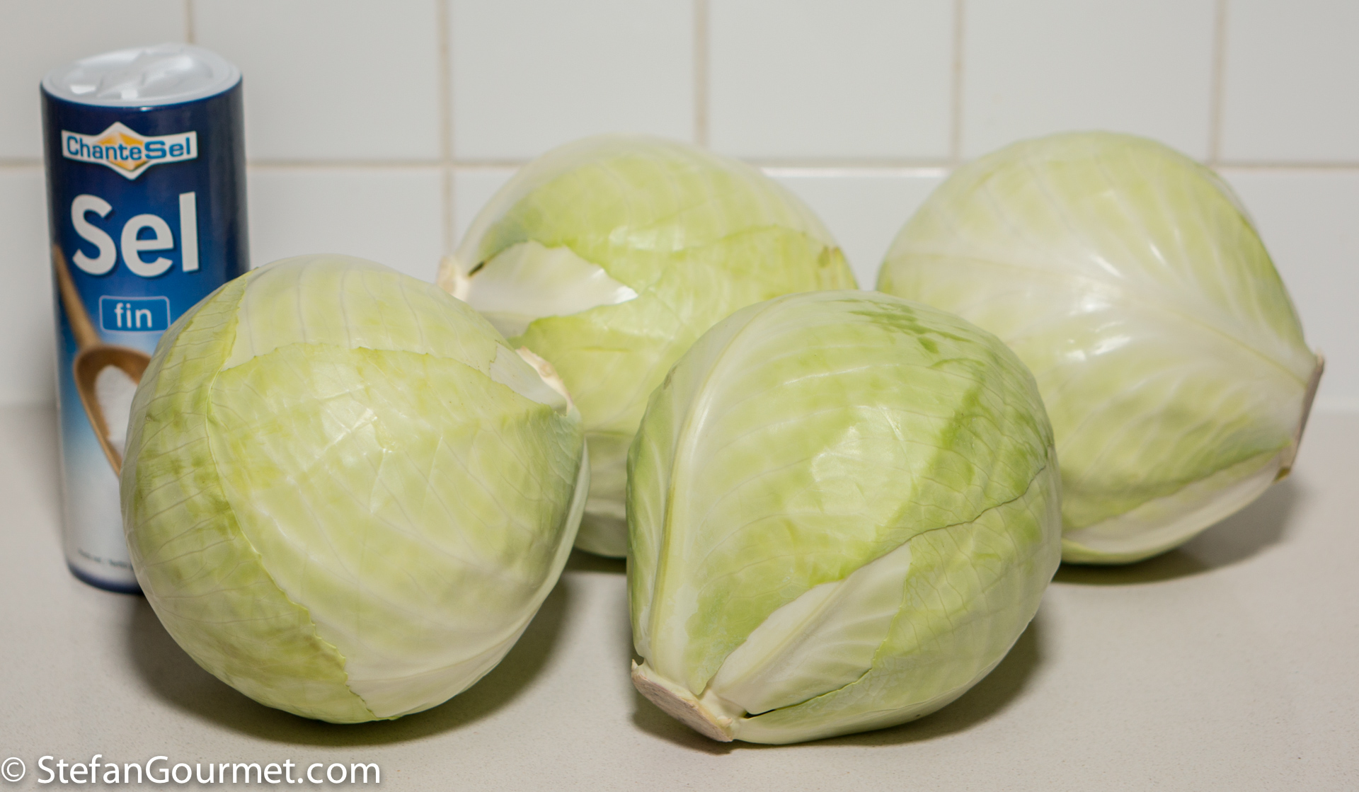 Nowadays we can buy sauerkraut in the supermarket, but it is more fun and more delicious to make it yourself. I had never done so yet, but it turns out to be quite easy. The only ingredients you absolutely need are cabbage and salt. You could add optional herbs and spices (like bay leaves and juniper berries) or white wine. And you could get the fermentation started by adding some buttermilk or yogurt, but that really isn’t necessary.
