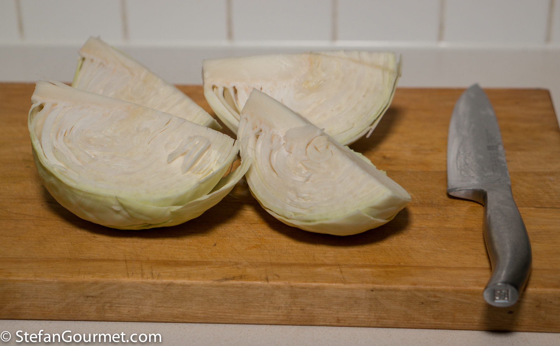 Do not wash the cabbage, but simply discard the outermost leaves. Cut the cabbage into quarters.