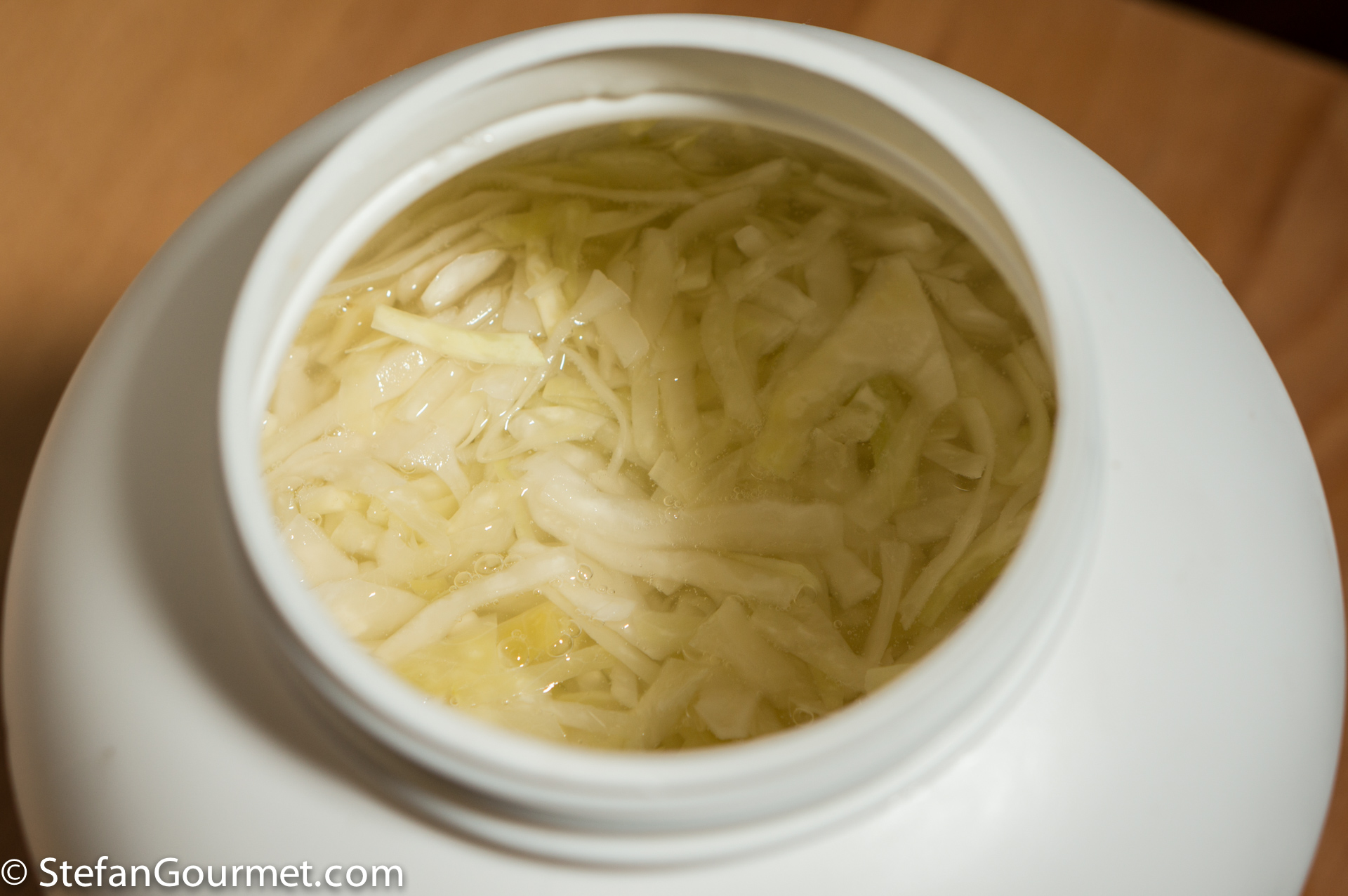 You are now supposed to put something heavy on top of the cabbage to keep it submerged. The cabbage will only ferment when it is not exposed to oxygen. Since the opening of the container I used wasn’t large enough, I skipped that step and decided to stir the top layer once in a while instead.