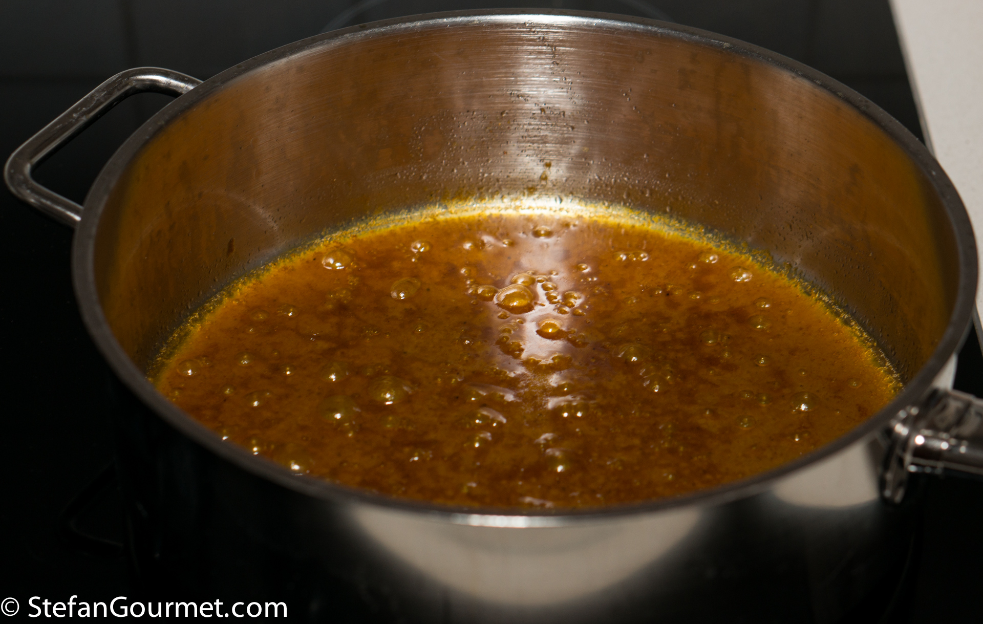 After those 24 hours, strain the juices from the sous-vide bag into a pan.