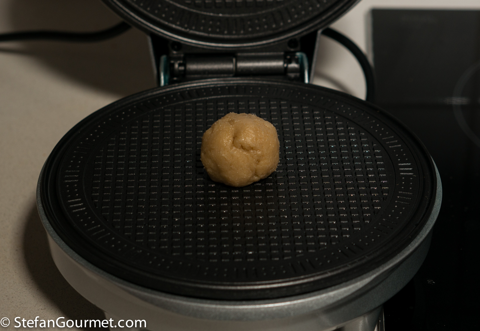 Heat up the waffle iron. When it is at cooking temperature, put a ball of dough in the center…