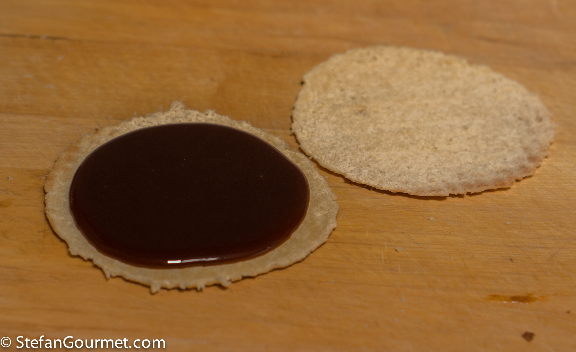 Put about a tablespoon of the syrup on the inside of the waffle and spread it out a little, leaving about 0.5 cm (1/4 inch) bare.