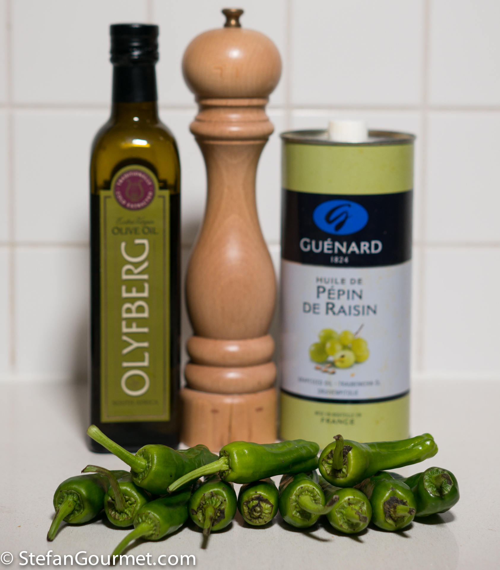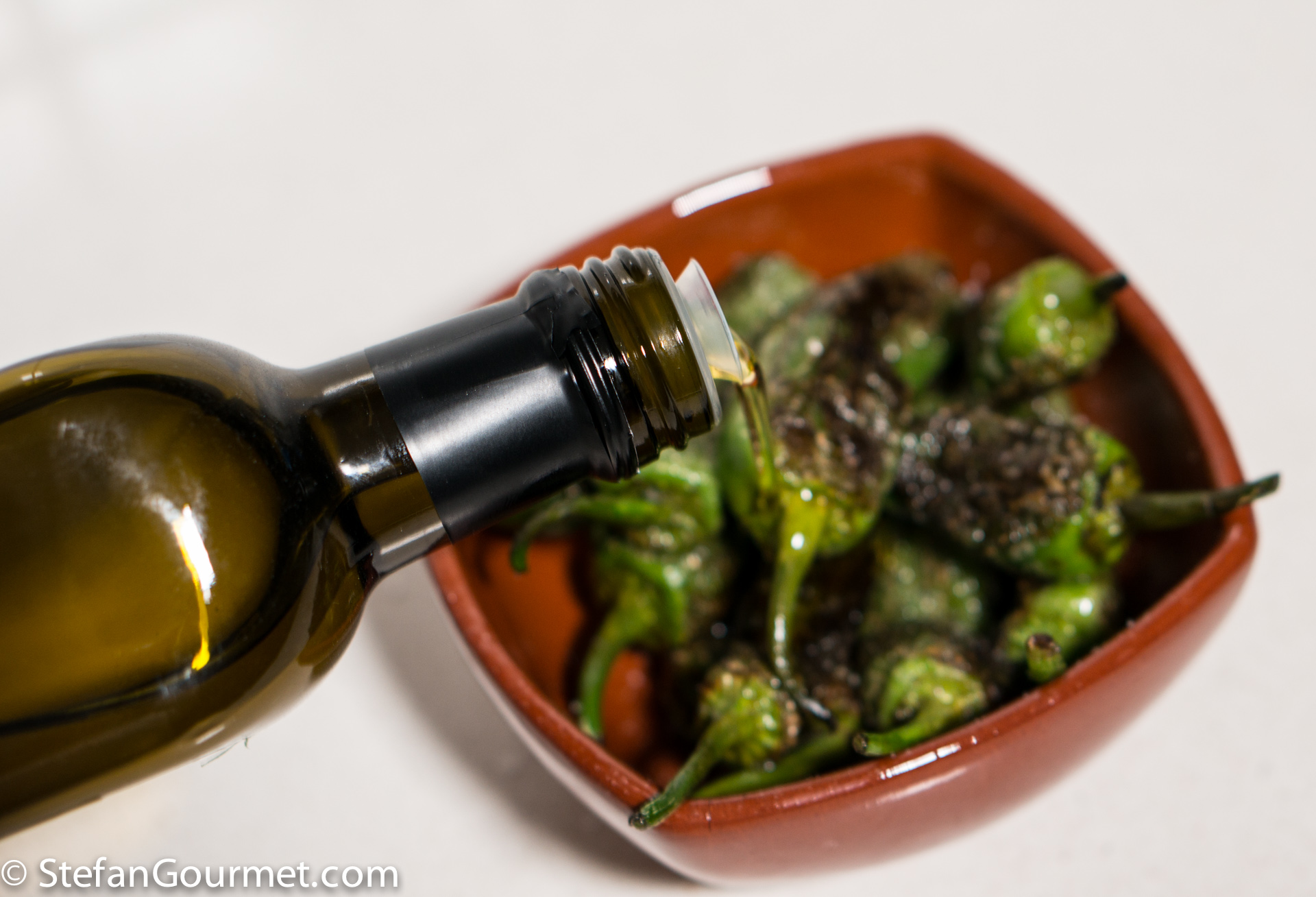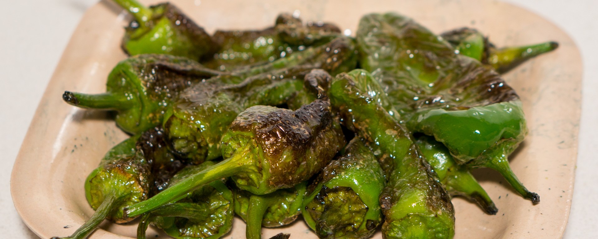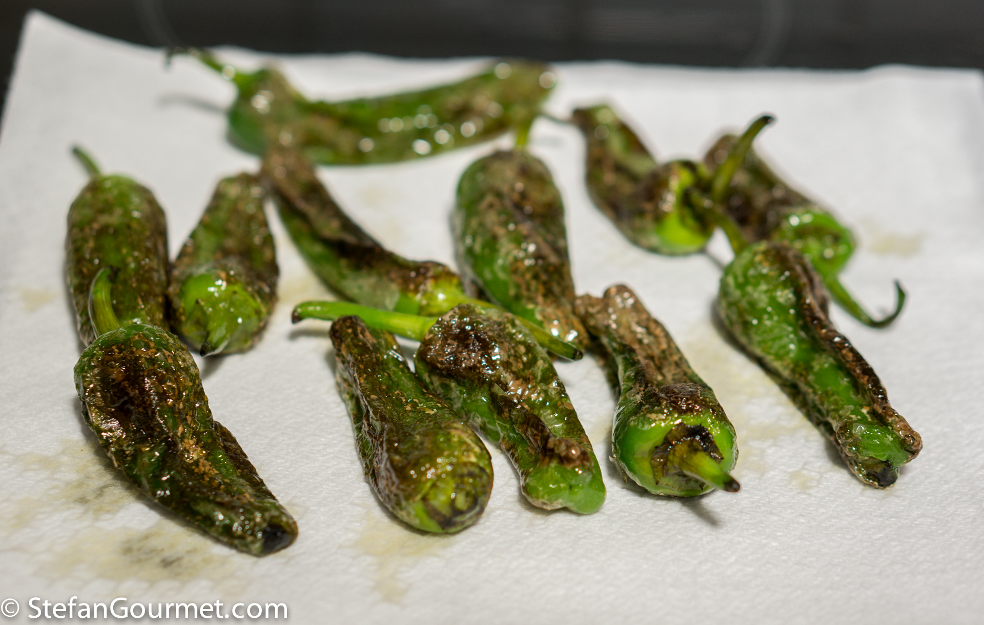 I make these with shishito peppers which similar to the Padron peppers. They taste great as you prepared them with a cracked pepper aioli.