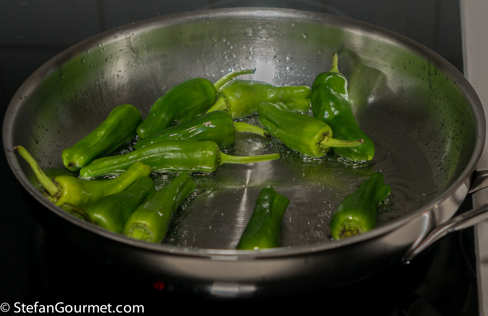 Pimientos de Padrón are green chilli peppers from Spain that are usually mild, but sometimes one of them can be very hot. They are very tasty, a bit like green bell pepper but better.
