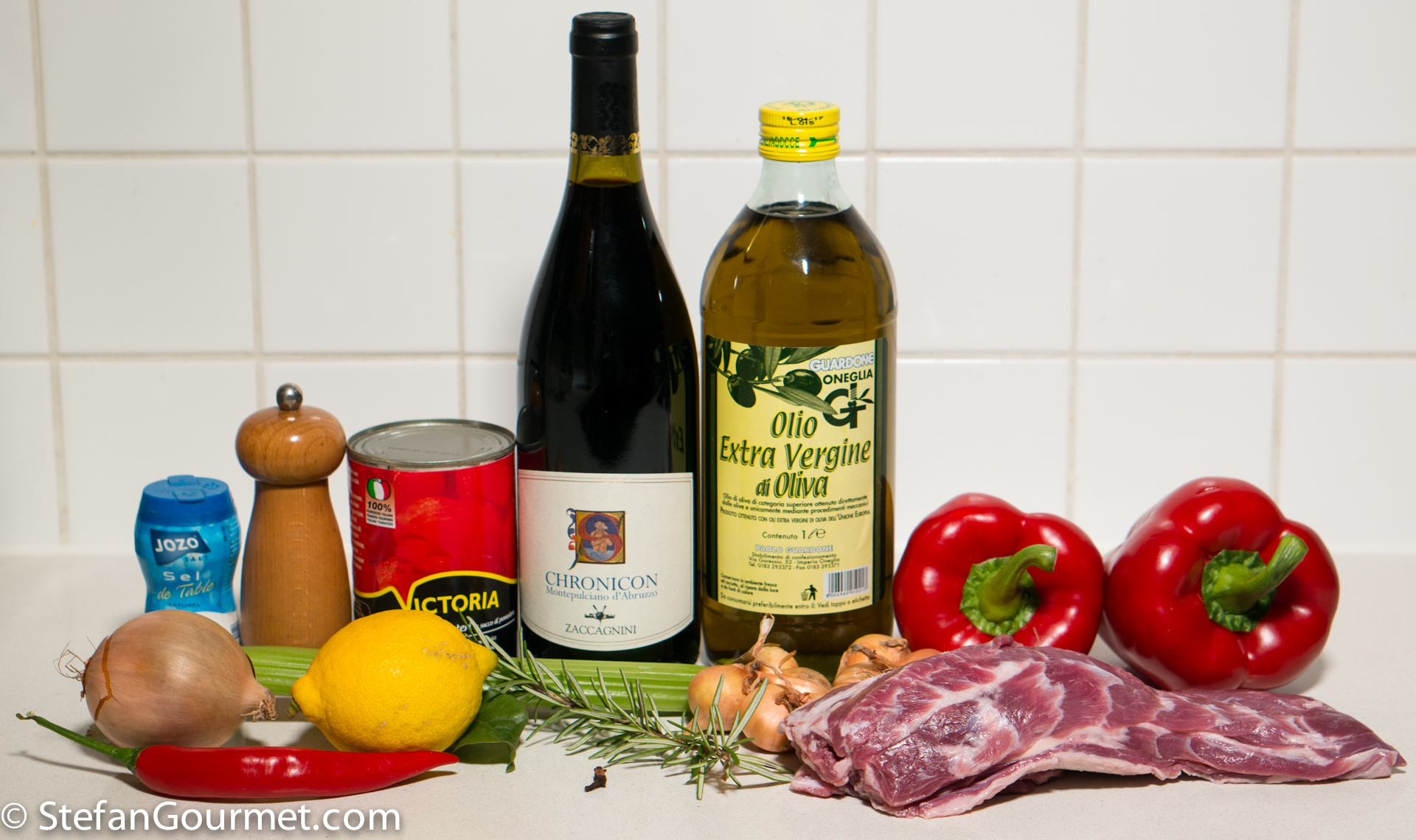 As with all Italian traditional recipes, there are many versions of capra alla neretese. The constant factors are goat meat (duh!), bell peppers, tomatoes, onions, and wine. Other common ingredients are rosemary and cloves. The wine can be either white (Trebbiano d’Abruzzo, which by the way is not the same grape variety as Trebbiano Toscano, also known as Ugni Blanc) or red (Montepulciano d’Abruzzo, not to be confused with sangiovese-based Vino Nobile di Montepulciano). I opted for the red, since I thought it would be nice to drink the balance of the bottle with the dish.