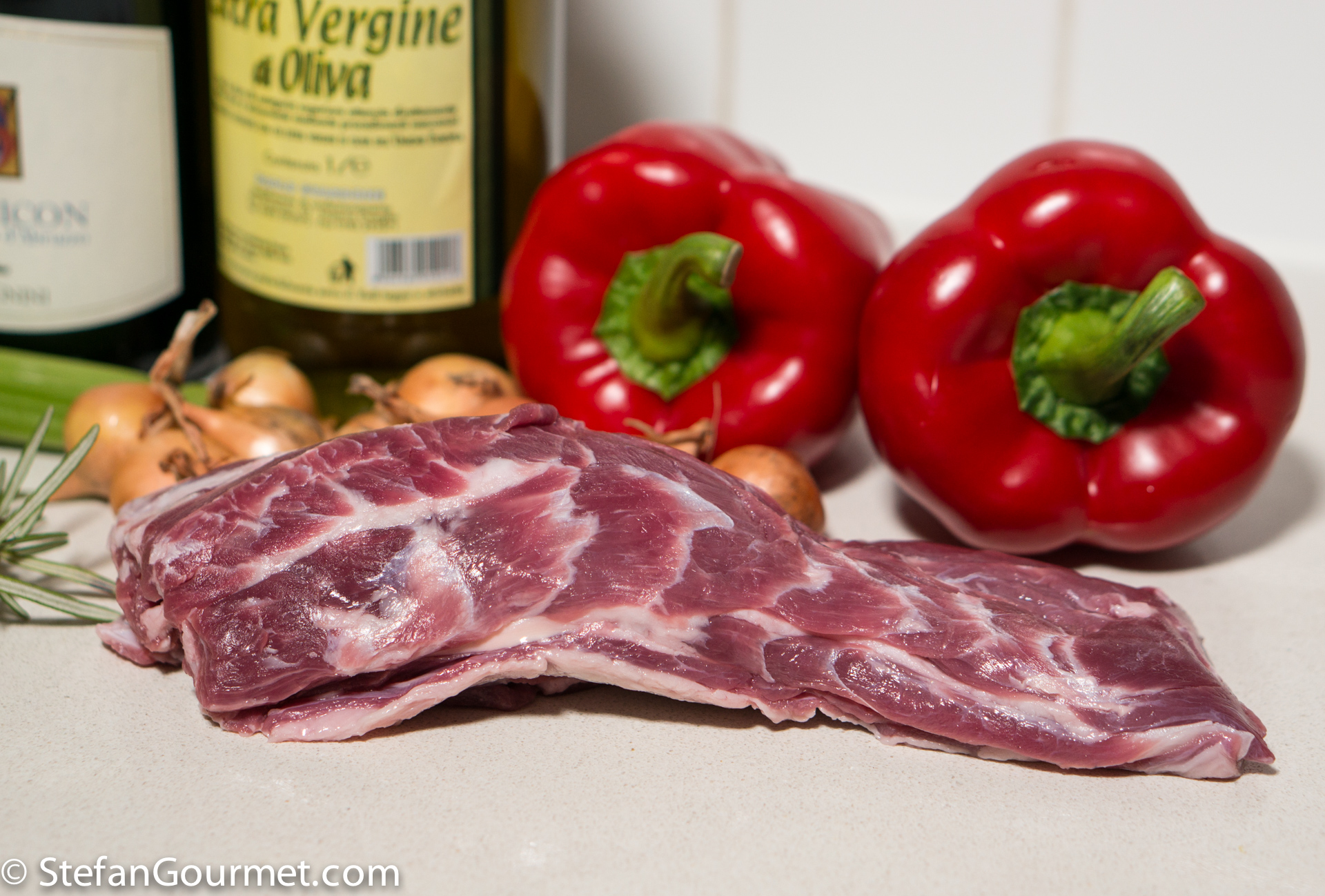 After reading Conor’s post in which he showed us how to prepare delicious roast leg of goat, I got curious and wanted to try goat meat, too. Now there are a lot of goats in the Netherlands, kept primarily for milking, but since there is no local market for the meat it all gets exported. And so although lamb is easily available everywhere, I’ve never seen goat at a butcher’s, let alone a supermarket. But some googling revealed that there is a goat farm in Amsterdam that sells goat meat to the public. Unfortunately it is frozen, but that is better than no goat at all and so I came home with a nice piece of goat neck with beautiful marbling. It is meat from a young goat that is between 5 and 7 months old (called “chevon” in the Netherlands). (Click here to find out where to buy goat meat in the Netherlands.)
