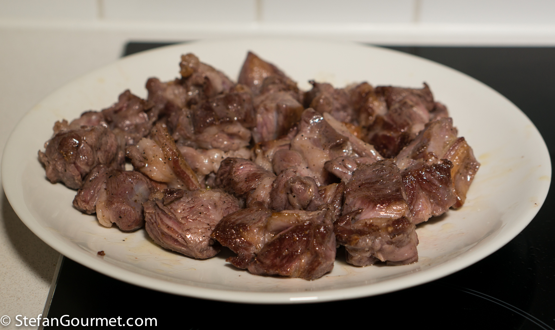 I’ve read Kenji’s post and have tried the different browning, but with lower sous-vide temperatures (below 65C/150F) it is not a good idea because browning on all sides helps to prevent funky smells that sometimes occur during long cooks at such temperatures. I guess it should be alright though at 74C/165F, but I didn’t think of that when I prepared this. What I did in this case instead is that I didn’t brown it so much that the cubes of meat would be dried out.