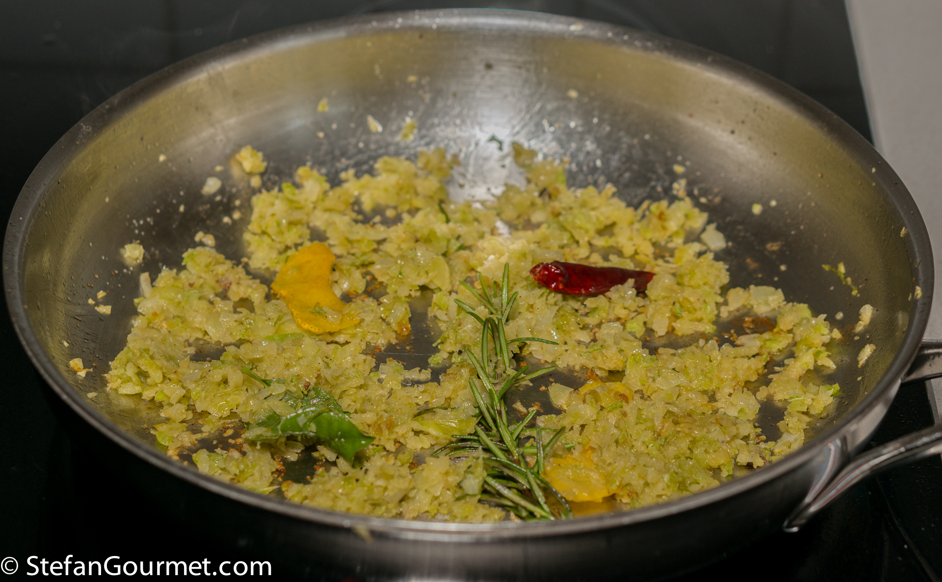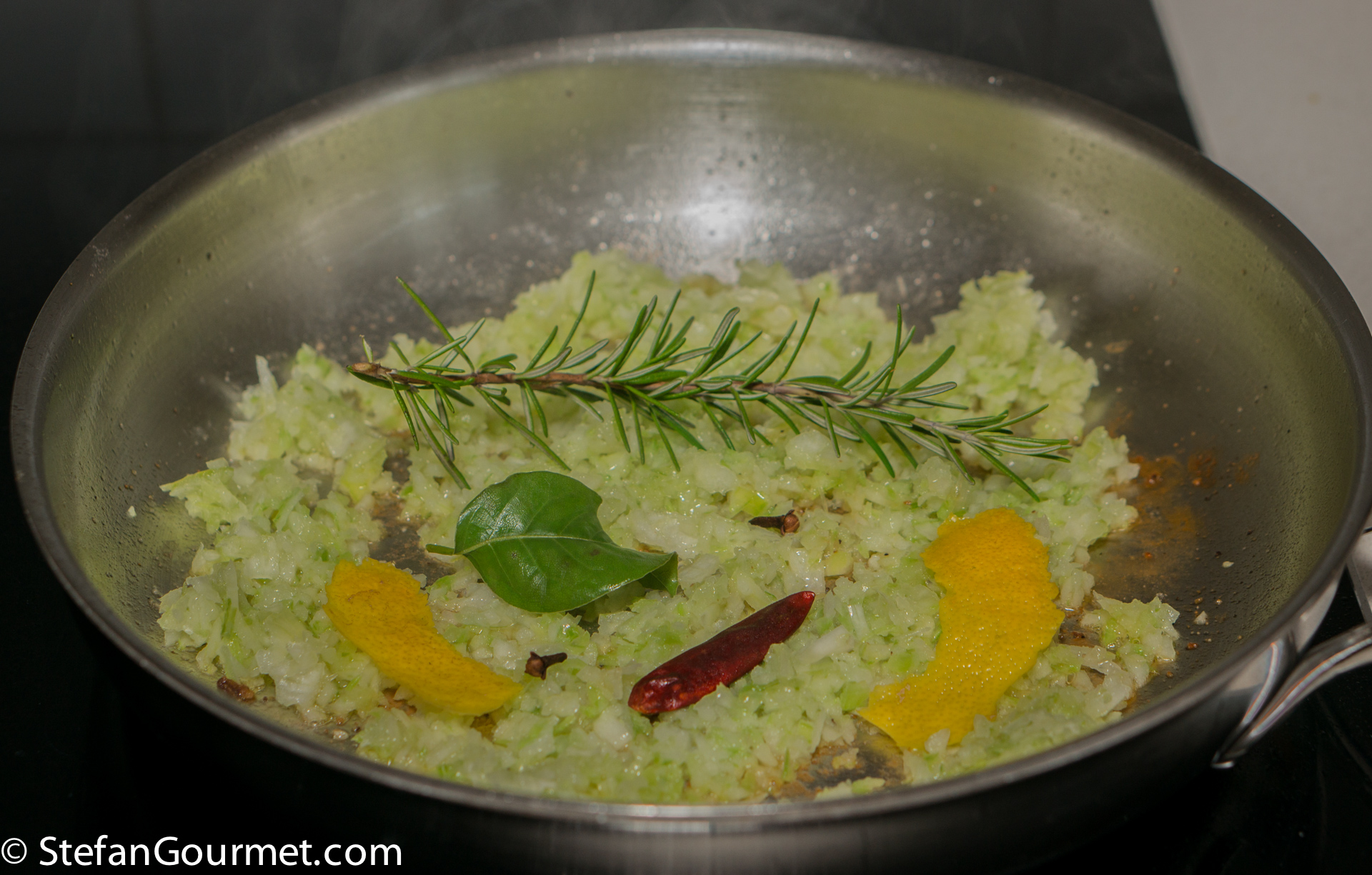 To this end, add a minced onion and a minced celery stick to the pan, and season lightly with salt. Add two strips of lemon peel, a sprig of rosemary, a bay leaf, and a chilli pepper.