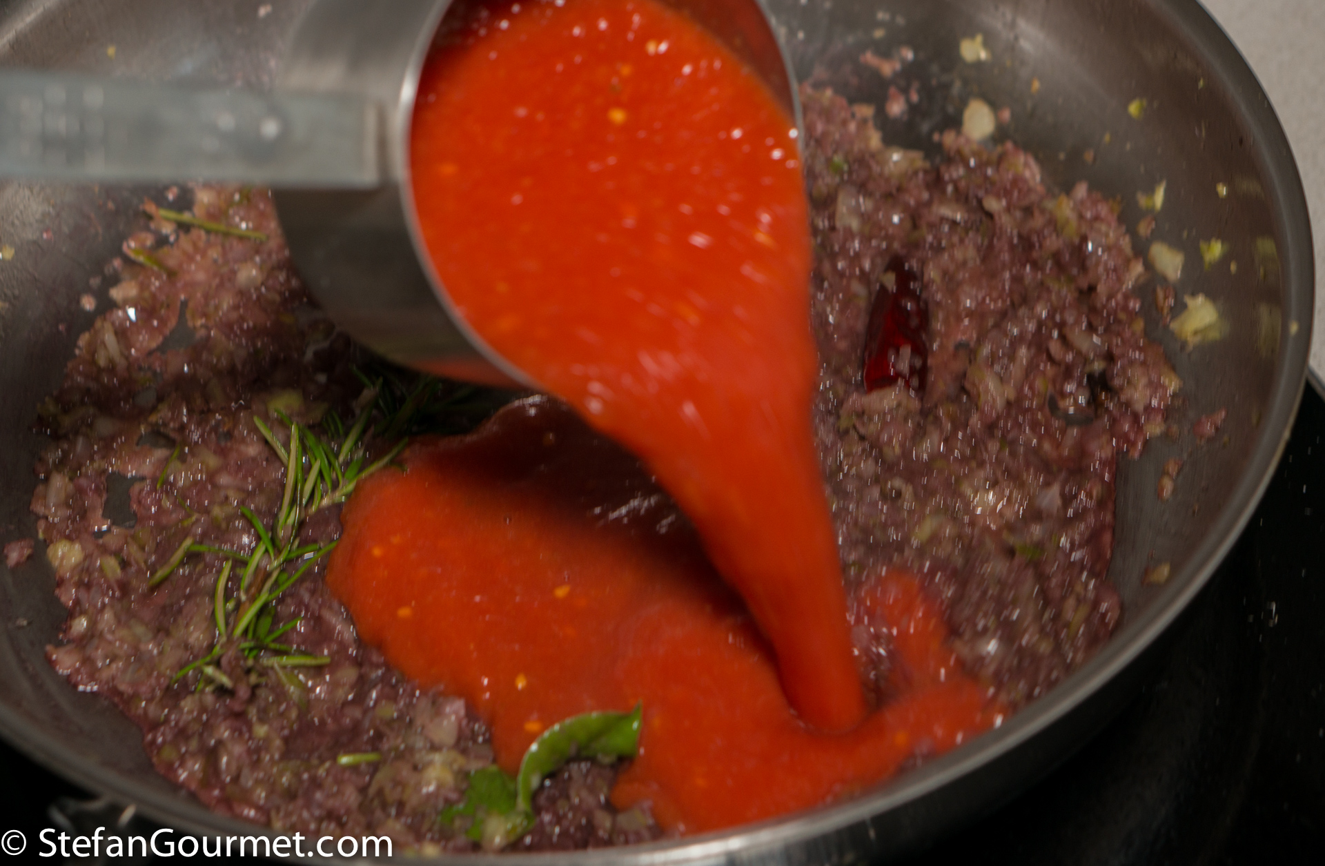 Now add the meat to the sauce, and stir briefly over medium heat until just warmed through. Taste and adjust the seasoning with salt and freshly ground black pepper.