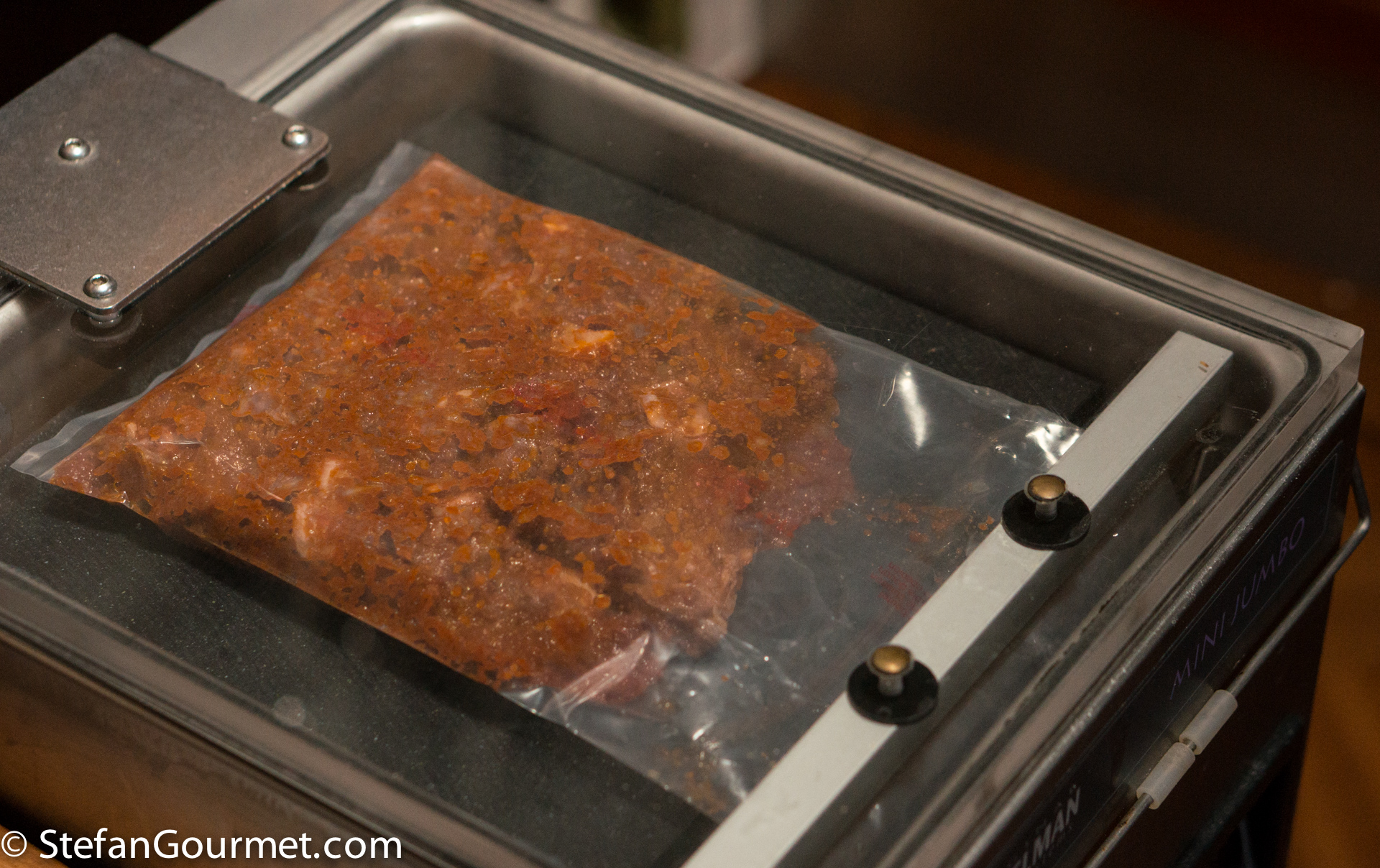 And voilà: vacuum sealed goat with sauce. Cook this sous-vide for 24 hours at 74C/165F. This time and temperature will make the goat fork tender and give it the flaky texture of a traditional stew. The advantage compared to stewing on the stovetop or in the oven that it will always be consistently tender and moist and doesn’t need any tending, while a stovetop or oven stew will require you to monitor and stir regularly, and it may still end up tough and/or dry.
