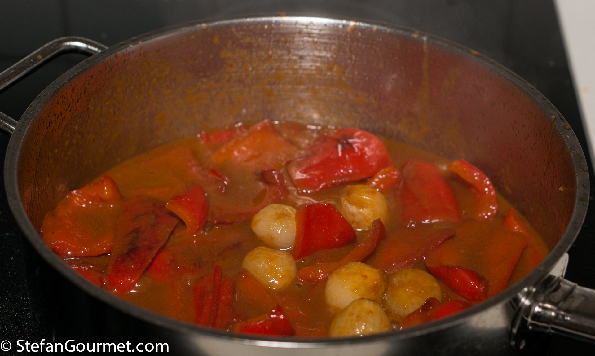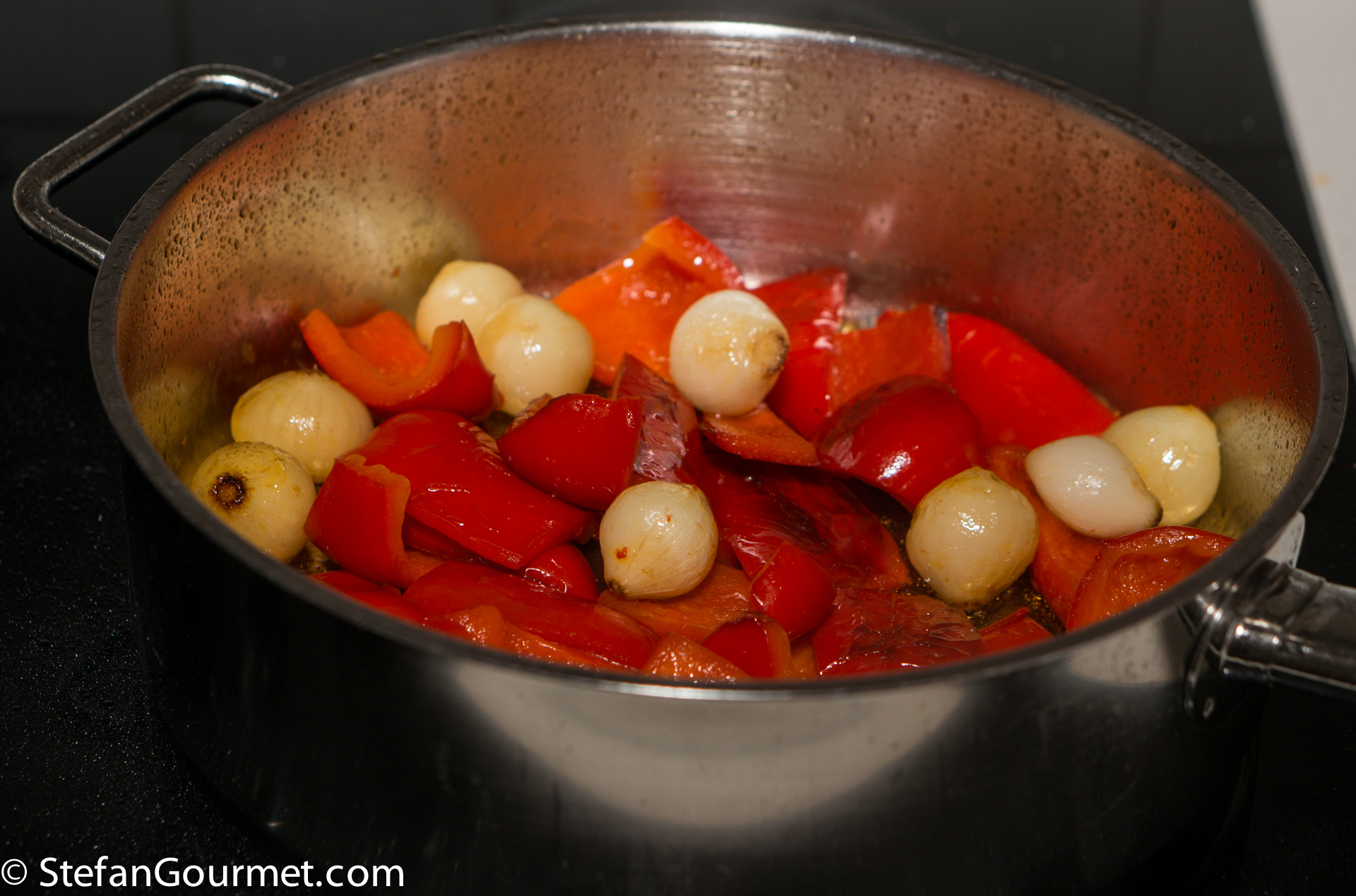 Clean the bell peppers and cut them into large strips or chunks. Peel the pearl onions (which is easier if you blanch them first in boiling water). Heat 2 tablespoons of olive oil in a frying pan and add the bell peppers and onions. Season with salt and stir for a couple of minutes.
