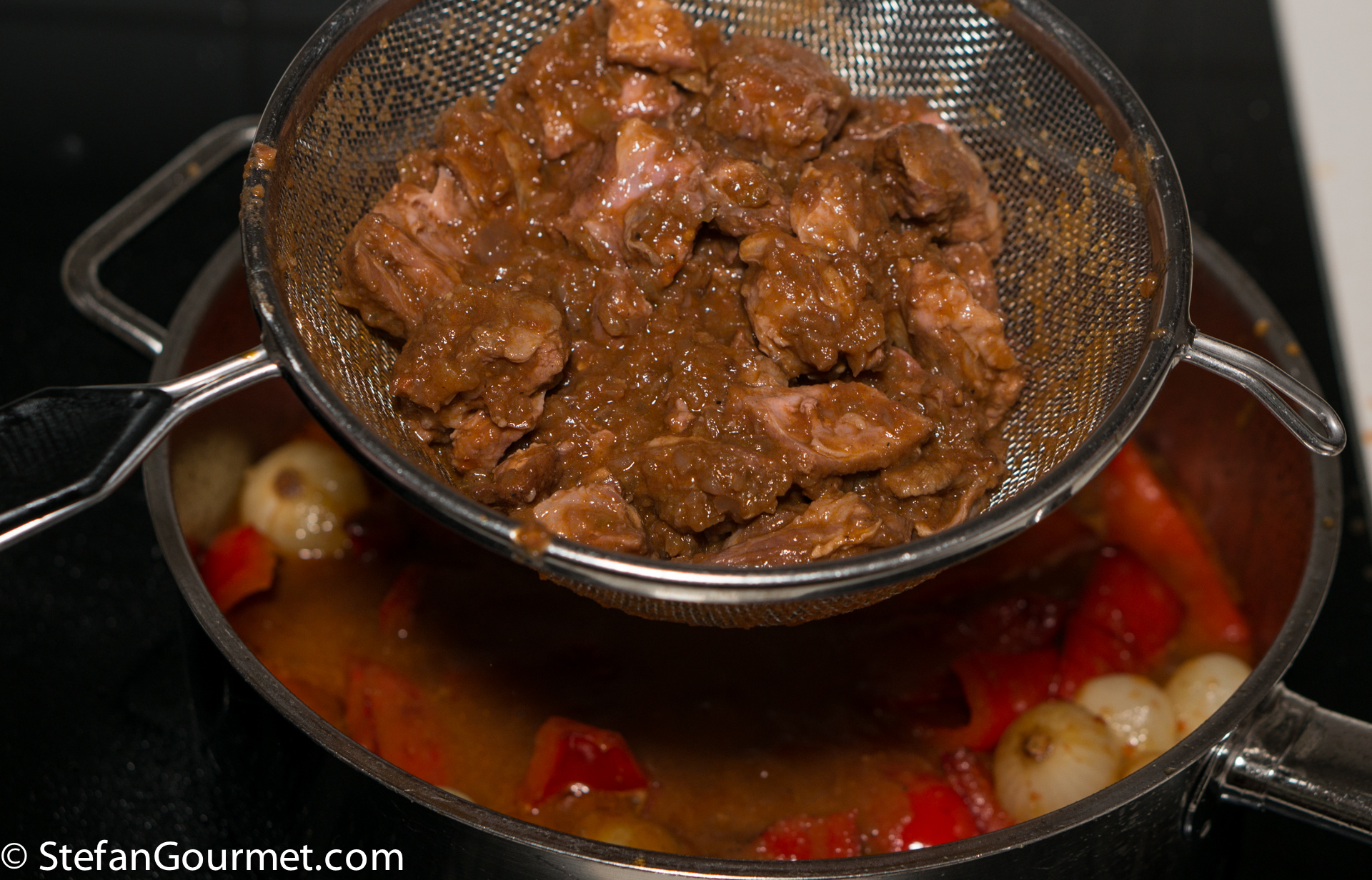 Strain the juices into the pan with the peppers and onions using a sieve. Reserve the cooked meat.