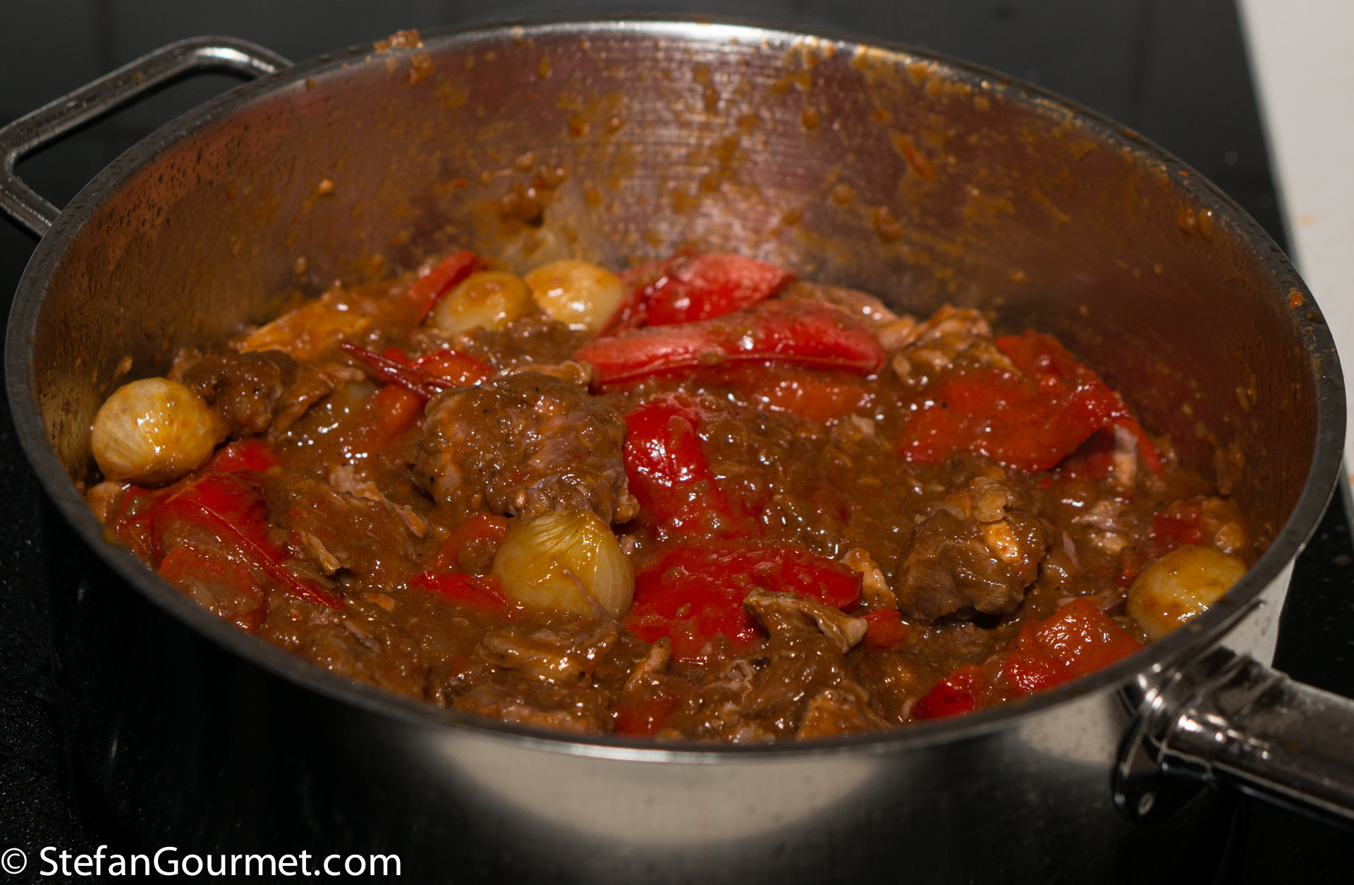 The next day, about an hour before you would like to serve the dish, start preparing the bell pepper and (optional) pearl onions. (You could also do this the same day you prepare the goat and reheat the peppers and onions to serve with the goat.)