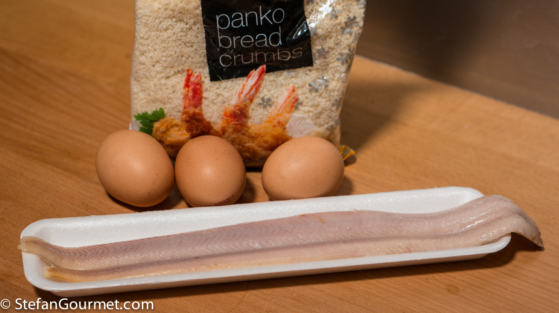 The ingredients are simple: smoked eel, eggs, and panko. Plus flour for dusting and ingredients for the dressing such as yogurt or mayo and chives.