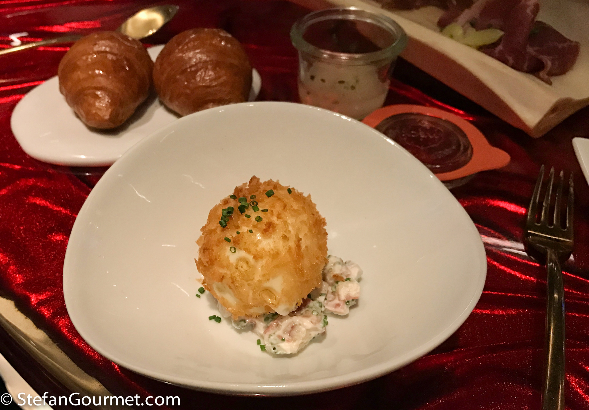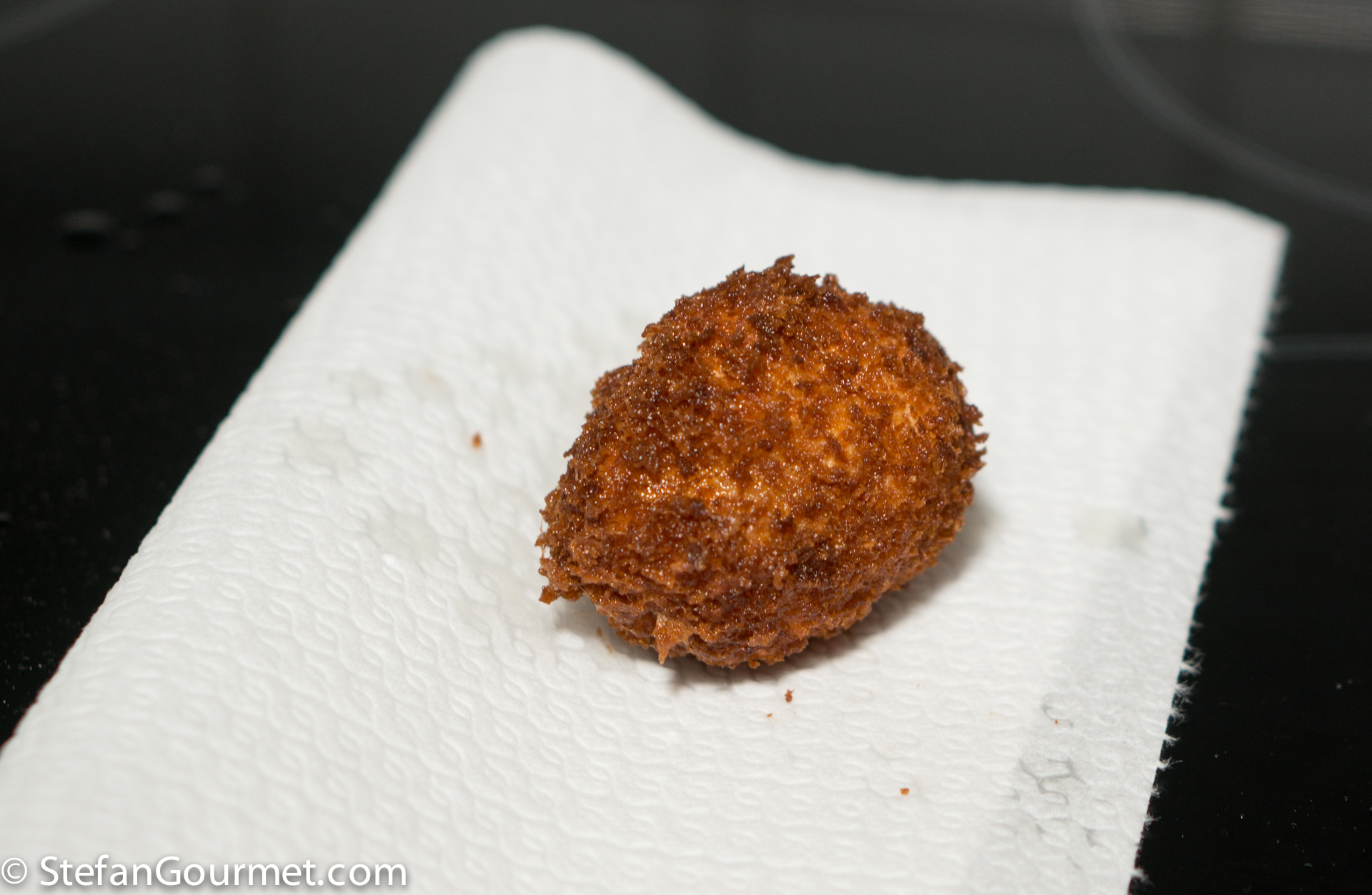 The crust was a bit too thick and a bit too dark (because the oil had been a bit too hot), and although the egg yolk was runny the egg did not have the proper texture and it wasn’t completely warm, because in the end I caved in and froze the egg after all to get at least some result. This was after boiling and trying to peel about a dozen eggs, and each of them breaking before I got less than half of the peel removed. Nowhere near the 60% success rate at Librije, but of course they have been serving these eggs on a daily basis for a while, so they’ve had much more practice and time to figure out how to do this.