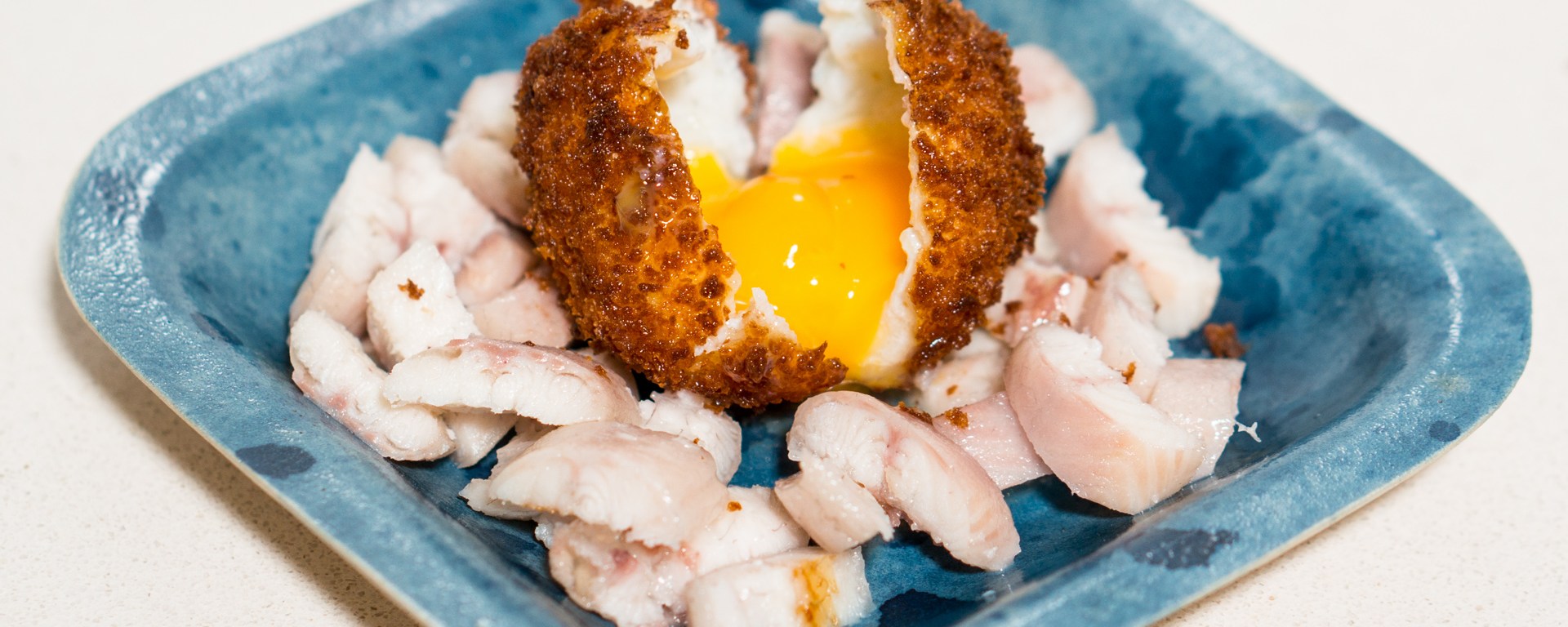 After the positive reactions to the report of my failure trying to make oyster sauce from fresh oysters, here is another experiment that didn’t turn out so well. The photo above is the “crispy egg” we got served for breakfast at Librije last December. It was amazing: a light and very crispy crust with a perfect soft-boiled egg inside, served on a bit of smoked eel salad. We asked the sous-chef who brought this to our table how it was made, if perhaps the egg had been frozen? He said they boiled the eggs briefly, then peeled them very carefully, followed by breading and deep frying. He also mentioned that they only managed to peel 6 out of 10 eggs without breaking them. This came from the kitchen of a restaurant with 3 Michelin stars, so perhaps I should have known better to try to recreate this at home. But it was so good that I thought it was worth a shot.