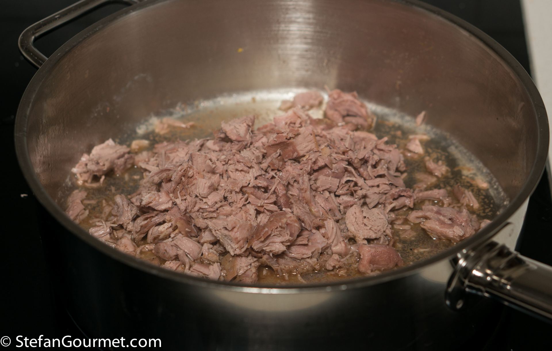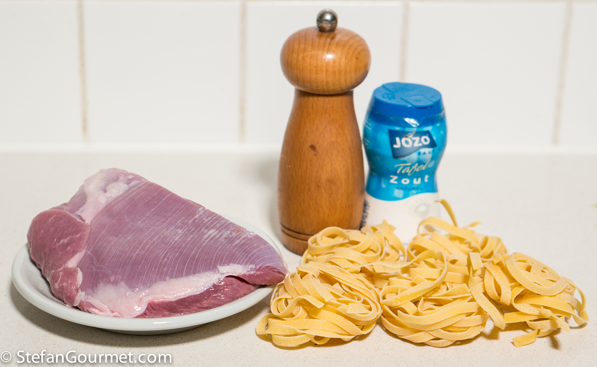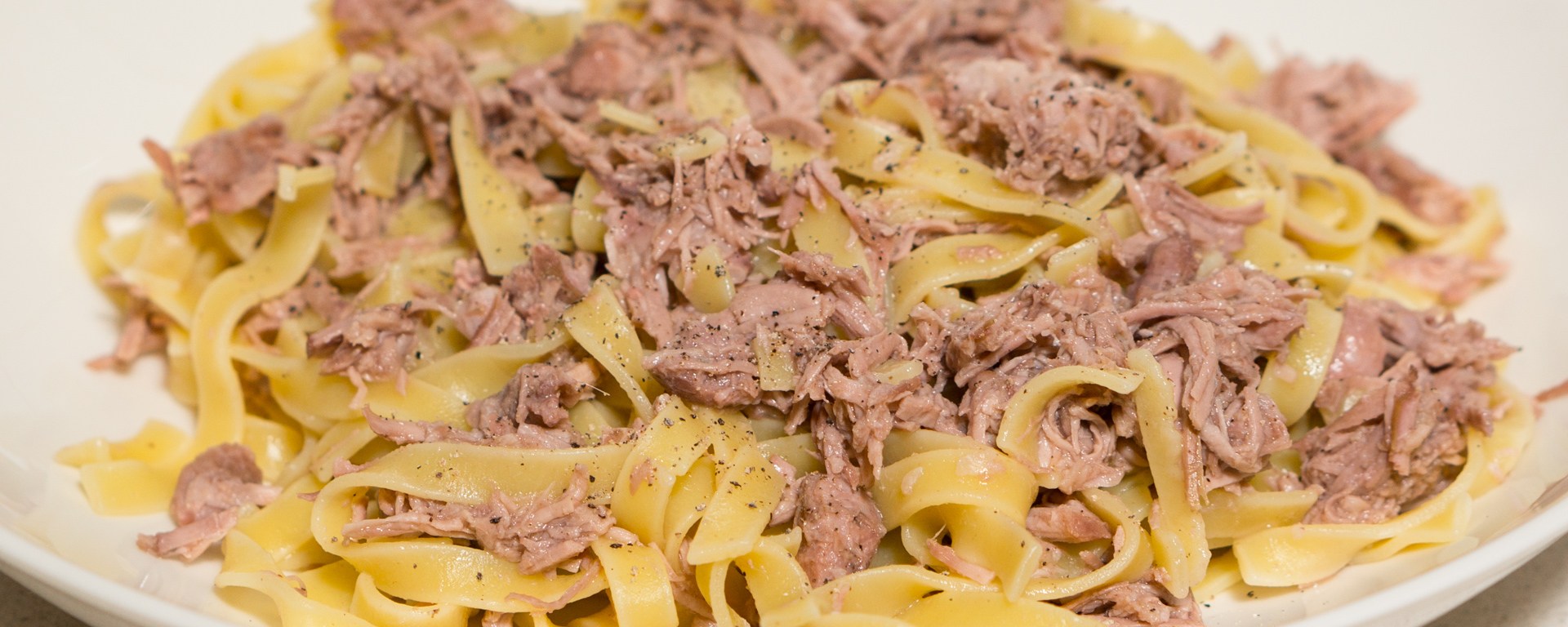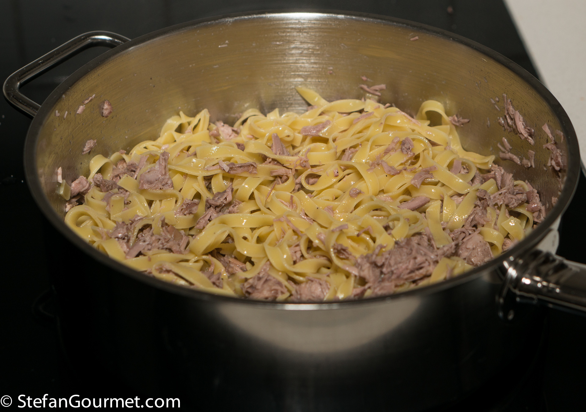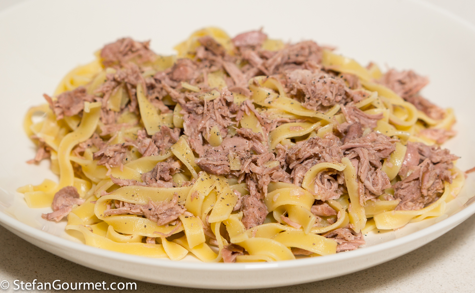 Can you make a delicious pasta dish using only four ingredients, counting salt and pepper as the first two? Yes, you can! Boneless and skinless turkey thigh becomes tender, flaky, juicy, and tasty after cooking it sous-vide for 24 hours at 74C/165F. It will release a lot of juices when cooked that way, but that is fine because those juices will be used to dress the pasta. Although you need to start the night before, the active time for preparing this dish is only 5 minutes: