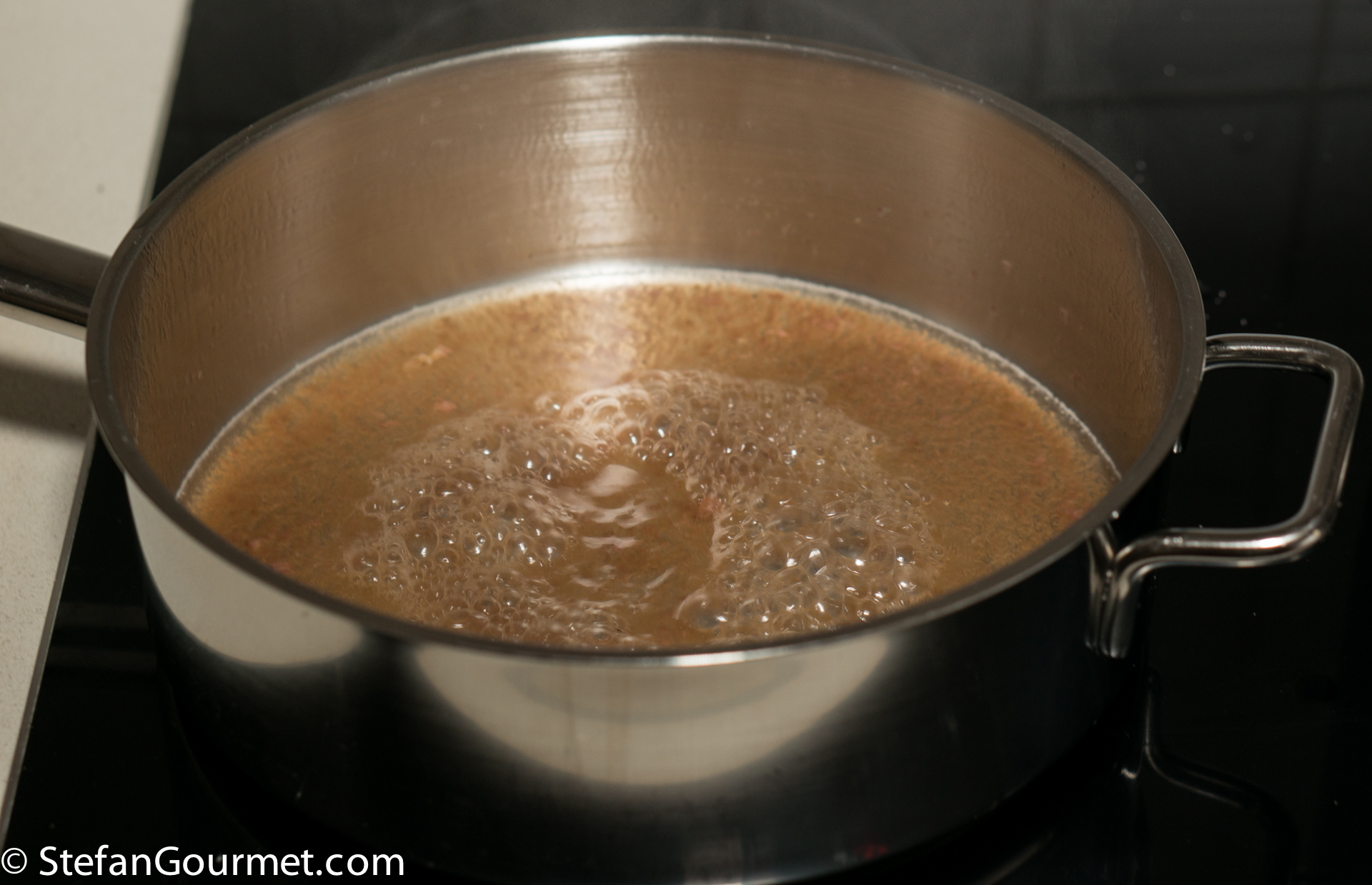 A minute before the pasta is ready, bring the juices in the pan to a boil, then turn down the heat to very low.