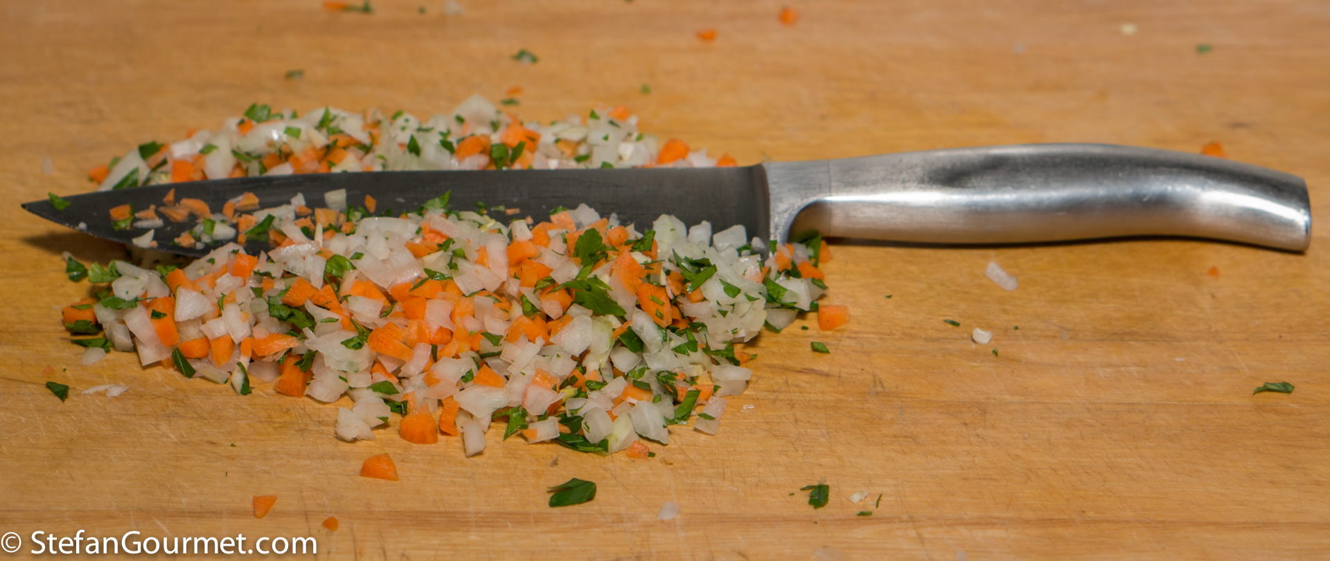 Mince garlic, carrot, onion, and parsley.