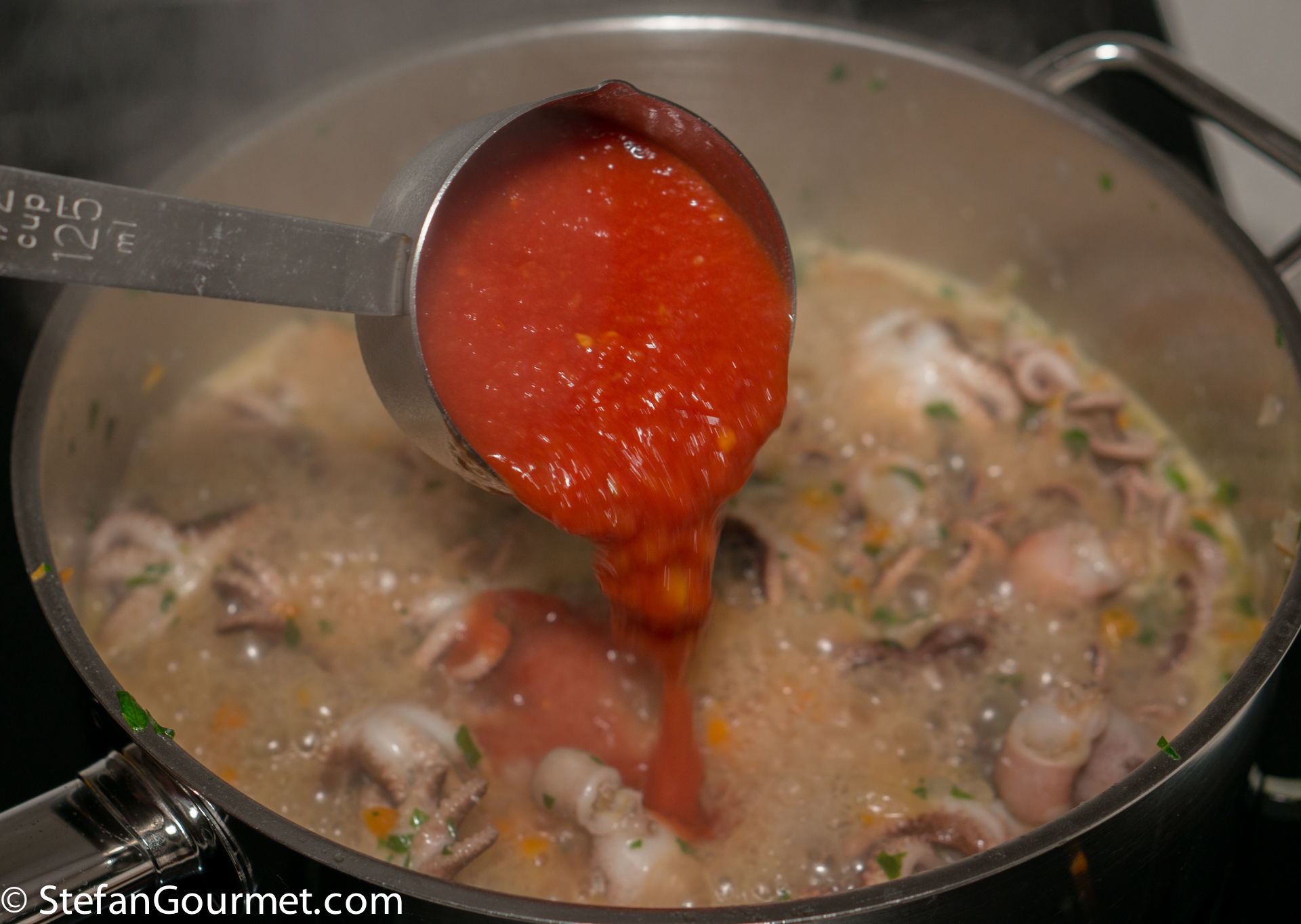 …and stir over high heat until the octopus releases its water.