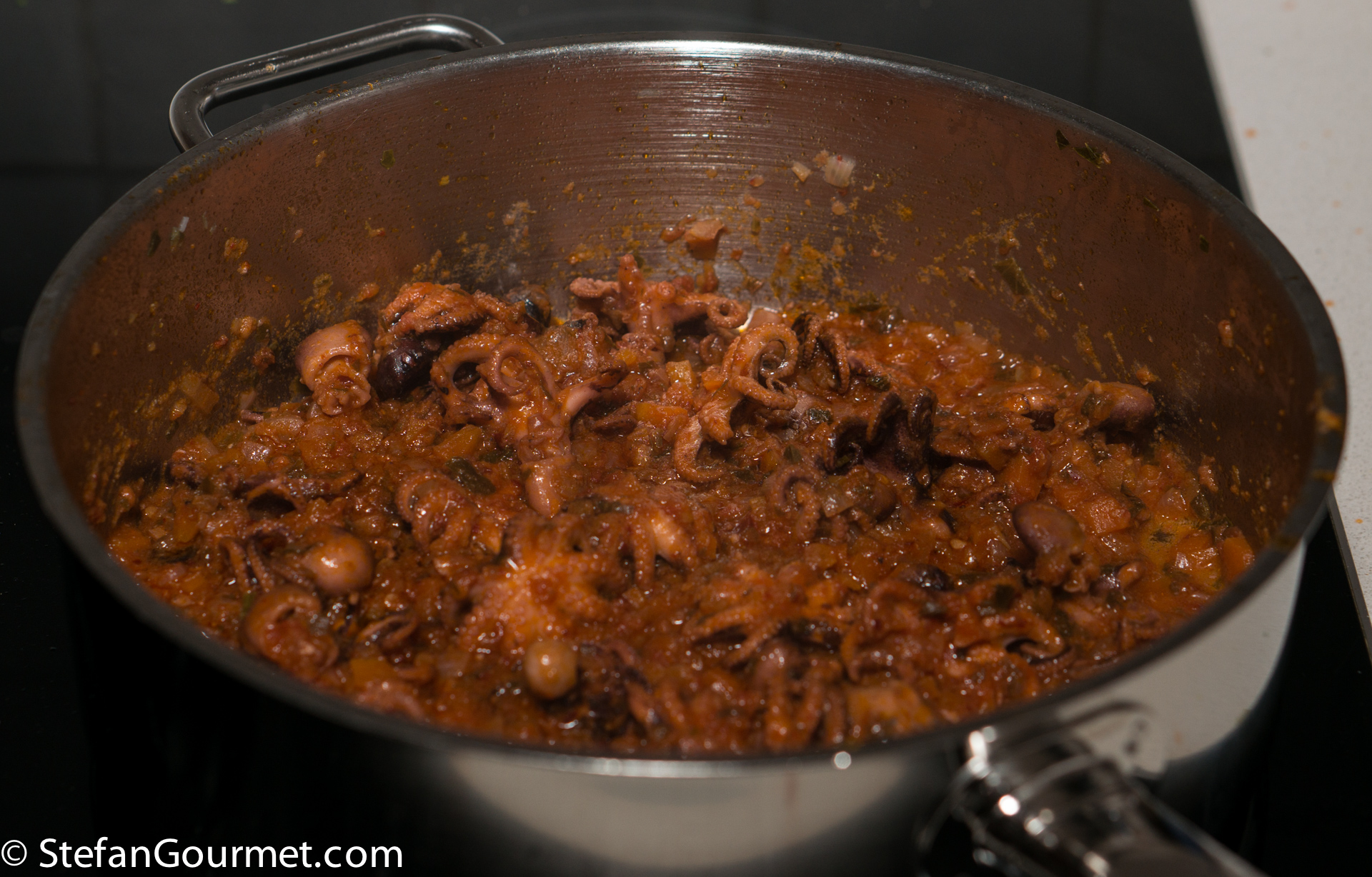 …until the octopus is tender and the sauce has been reduced, about an hour. Taste and adjust the seasoning with salt and chilli flakes.
