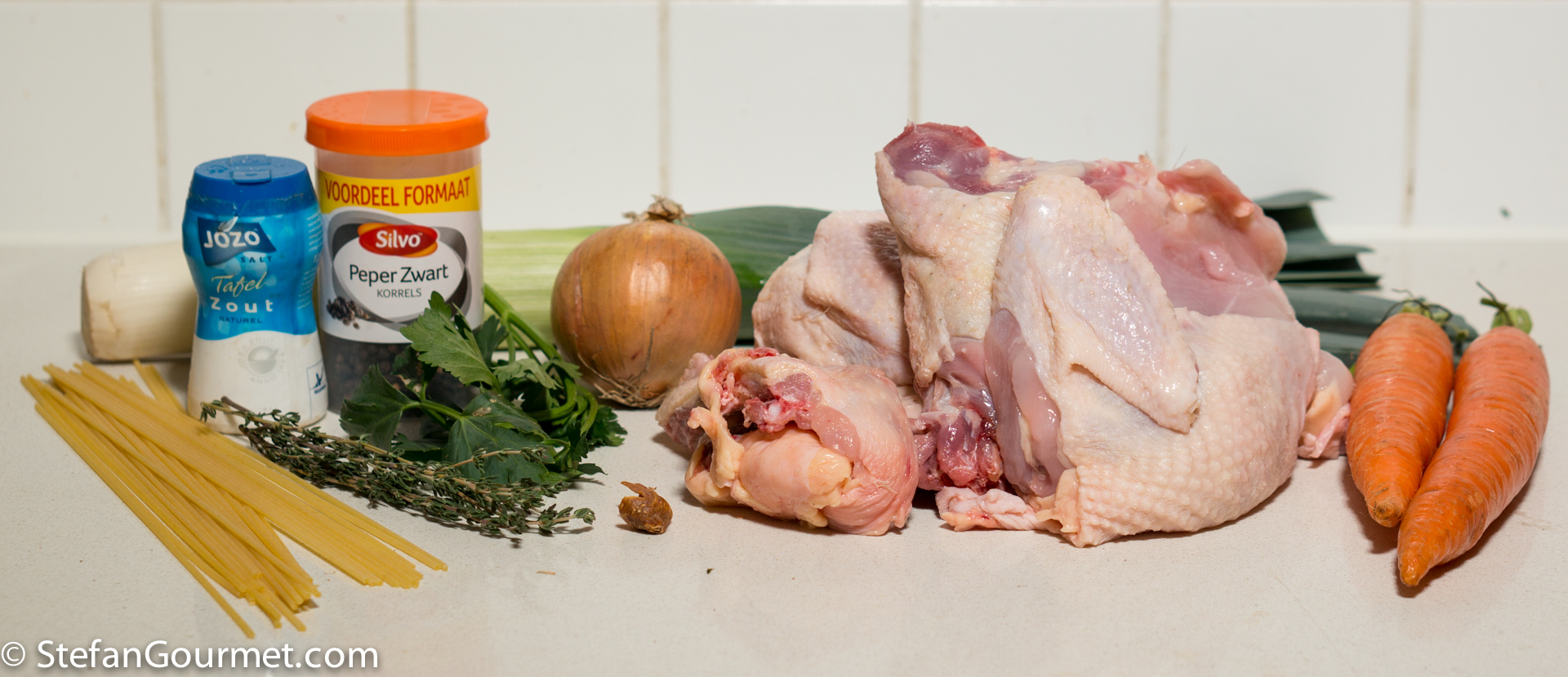 The noodles used in soup in the Netherlands are called vermicelli. That sounds Italian and it is — vermicelli are the same shape as spaghetti, but in the Netherlands vermicelli for soup are made from soft wheat rather than durum wheat, and they are broken into short pieces of about 2 cm (1 inch). Here I’ve used spaghetti broken into pieces, which is funny because cutting spaghetti would usually mean banishment from my dinner table 😉
