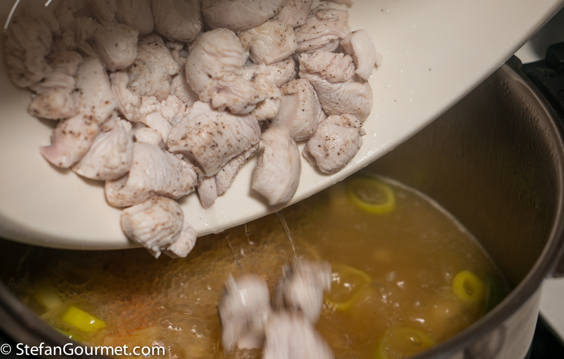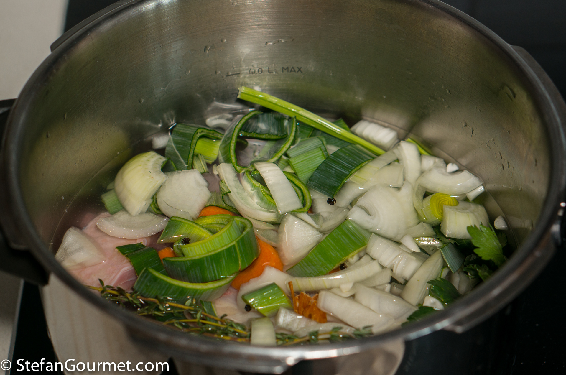 Put all the chicken meat and bones, except for the breast meat, in a stock pot or pressure cooker together with the green part of a leek, sliced, a chopped onion, a chopped carrot, thyme, parsley, bay leaf, mace, and black peppercorns. Cover with about 2 litres (4 cups) of water.