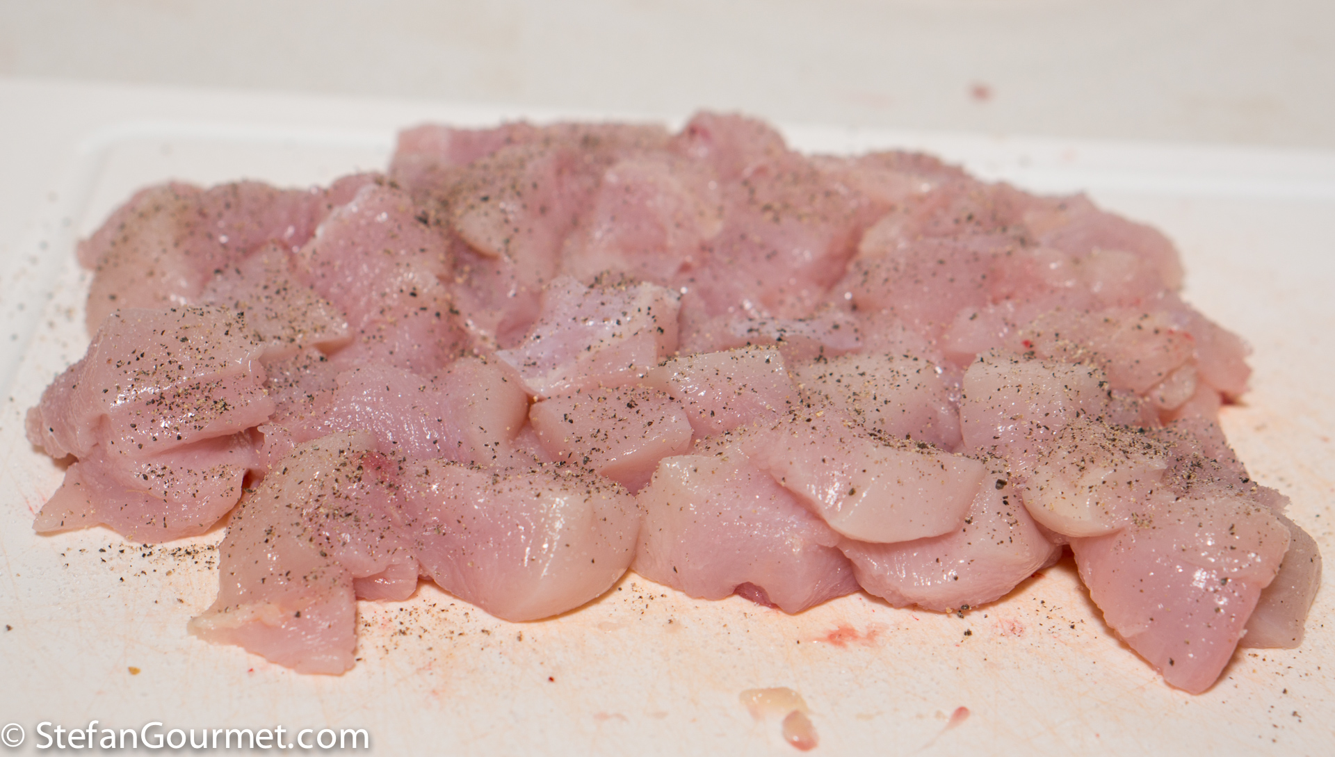 Meanwhile, cut the breast meat into 1.5 cm (1/2 inch) cubes and season with salt and freshly ground black pepper.
