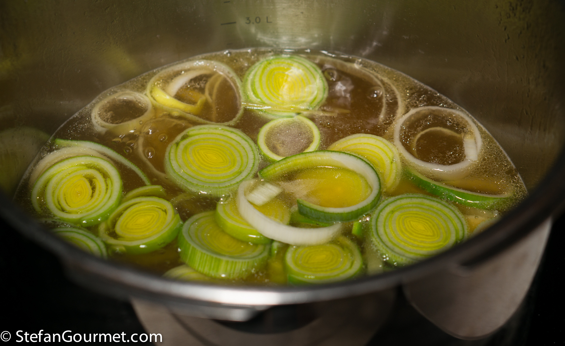 Cut the white part of the leek into rounds and cook in the boiling stock for about 5 minutes or until tender but firm to the bite.