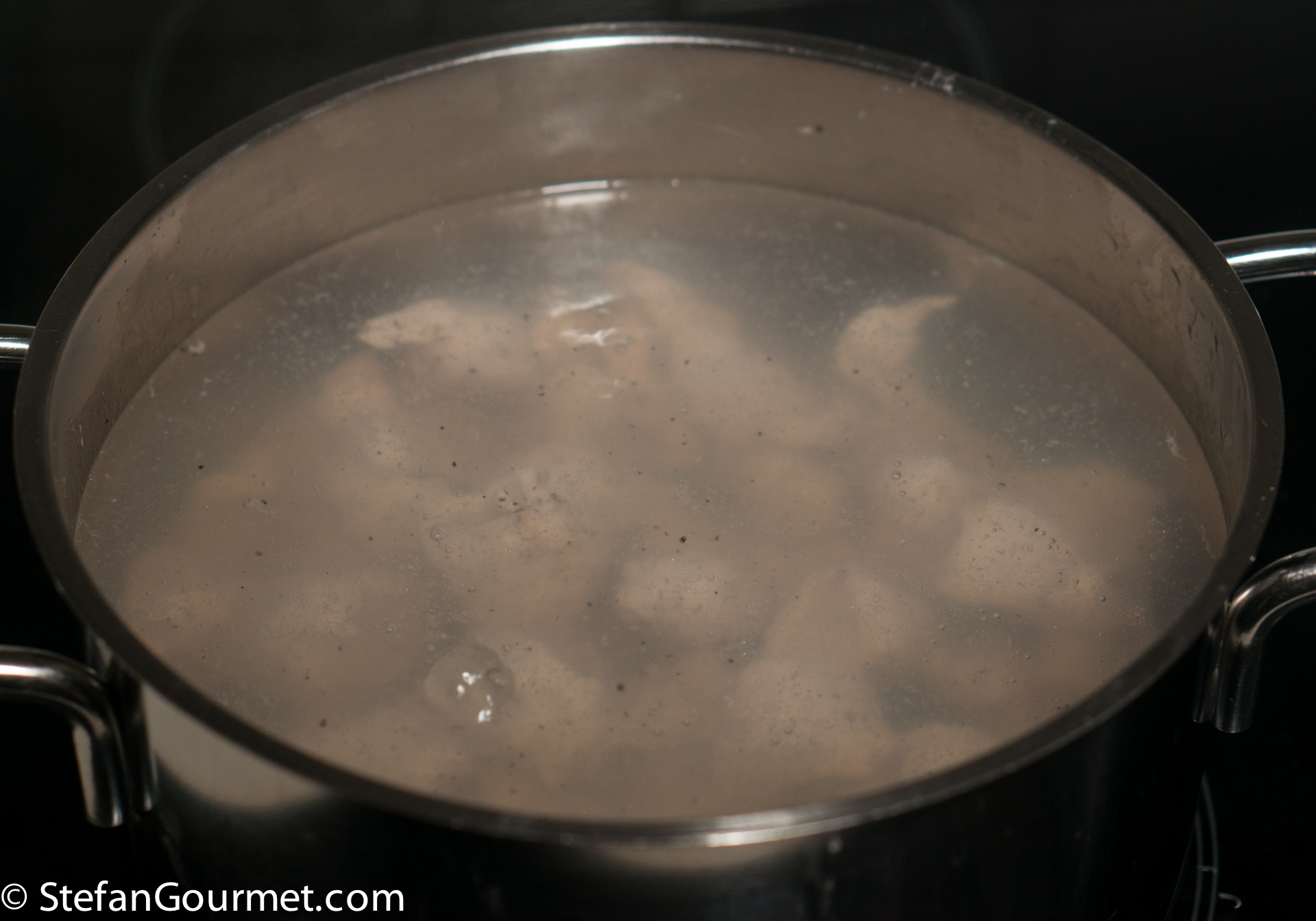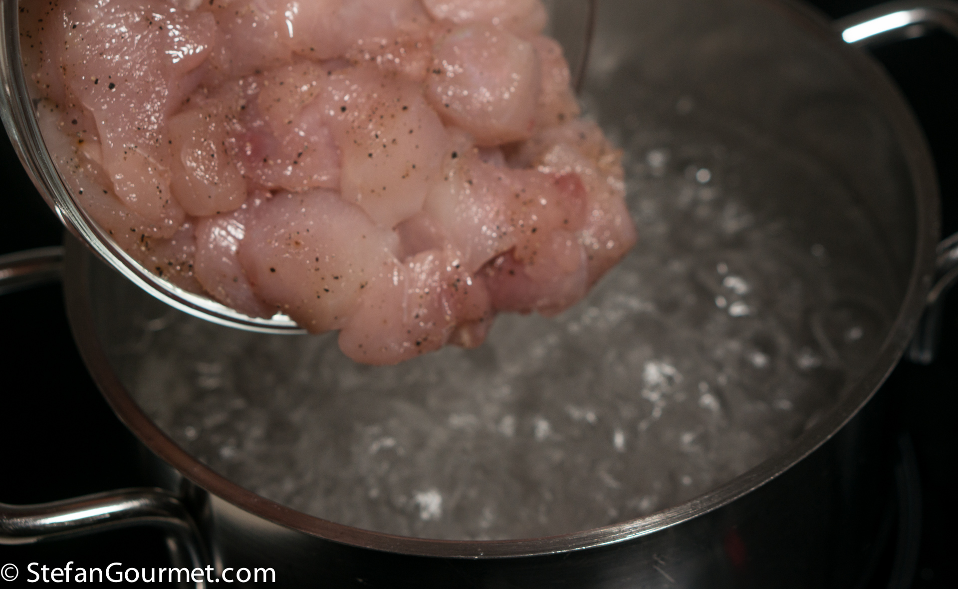 Cook just until the chicken has turned white, then plunge in cold water to stop the cooking.