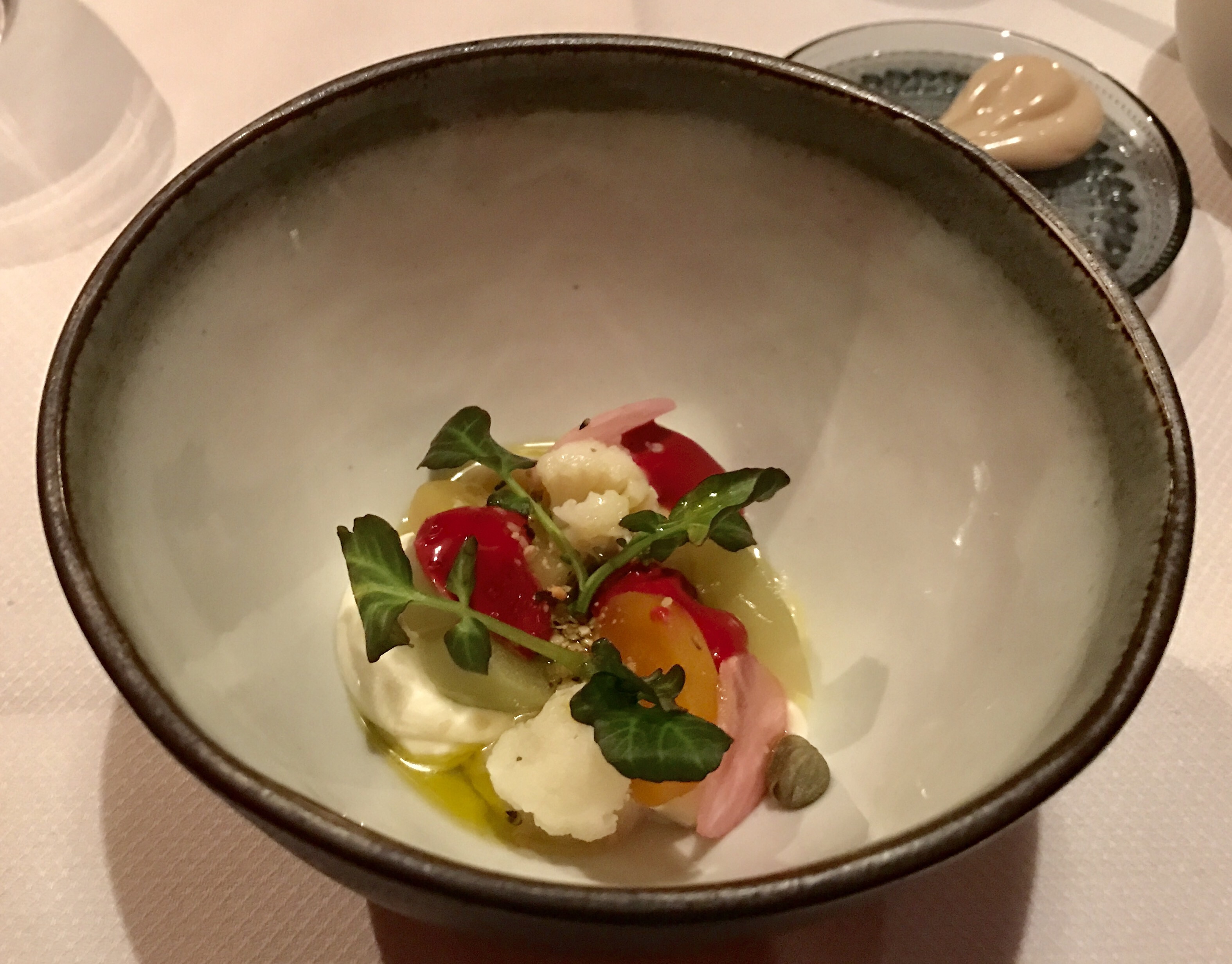 The appetizers came in a set of three. This salad of cauliflower, green tomato, yellow beetroot, and horseradish, was excellent. Great combination of flavors and textures, and delicious.