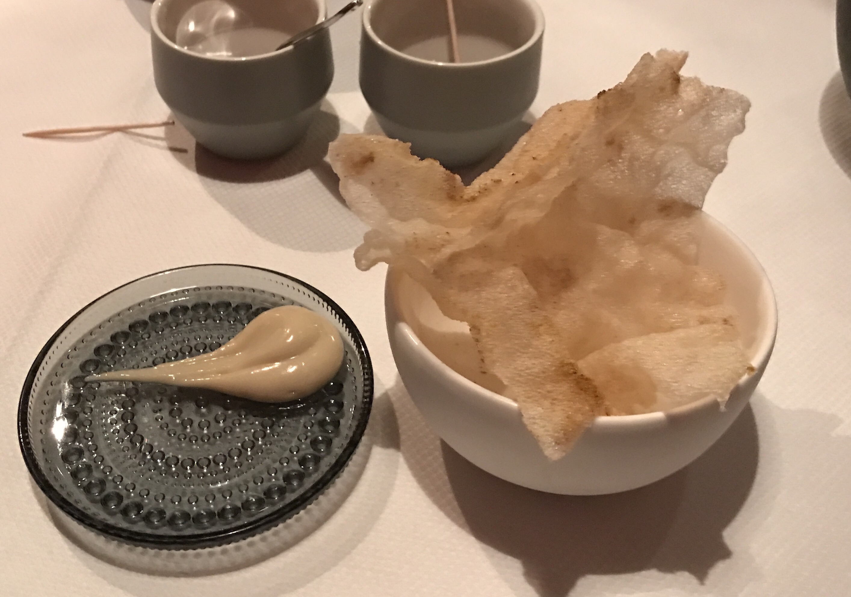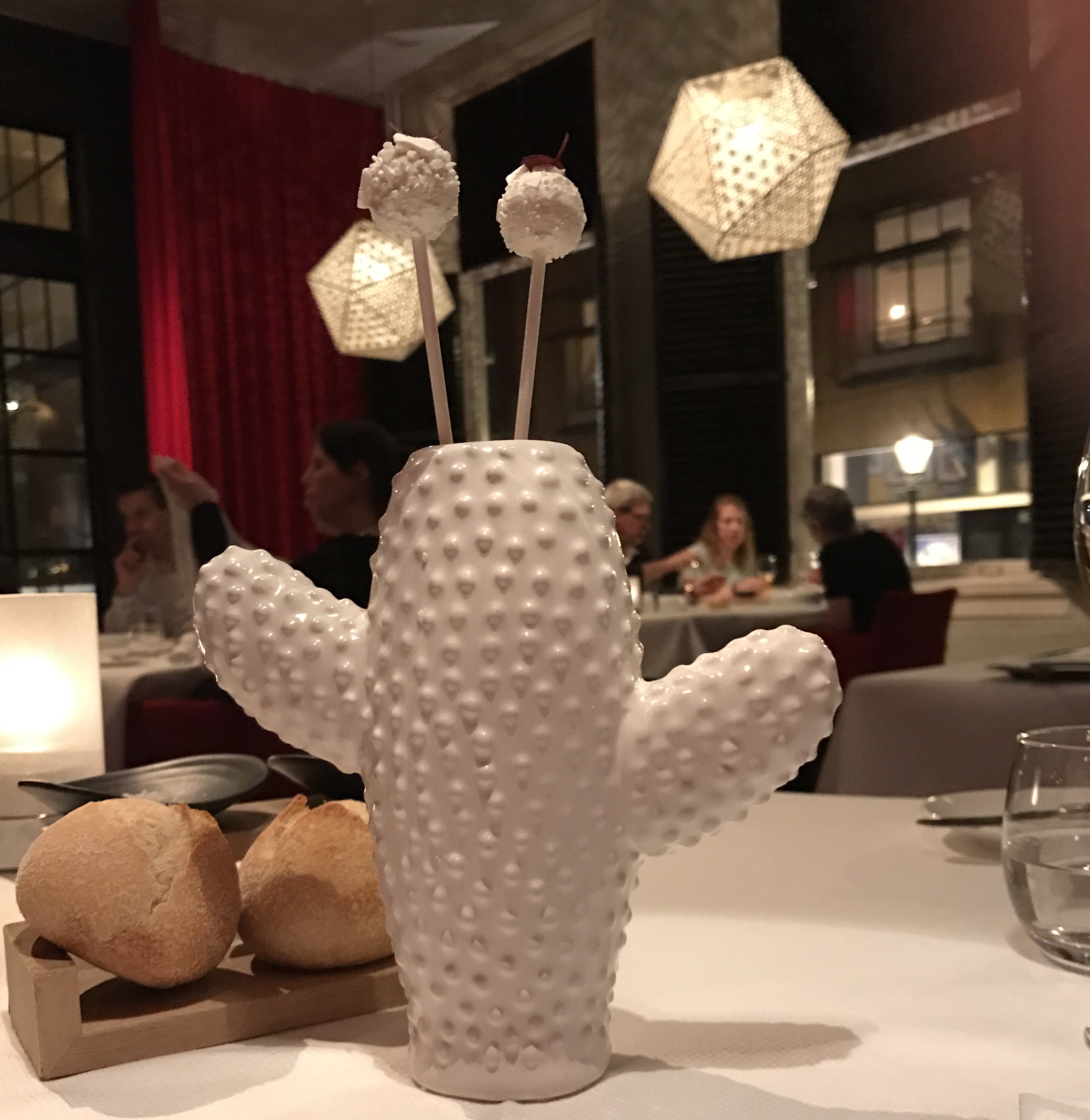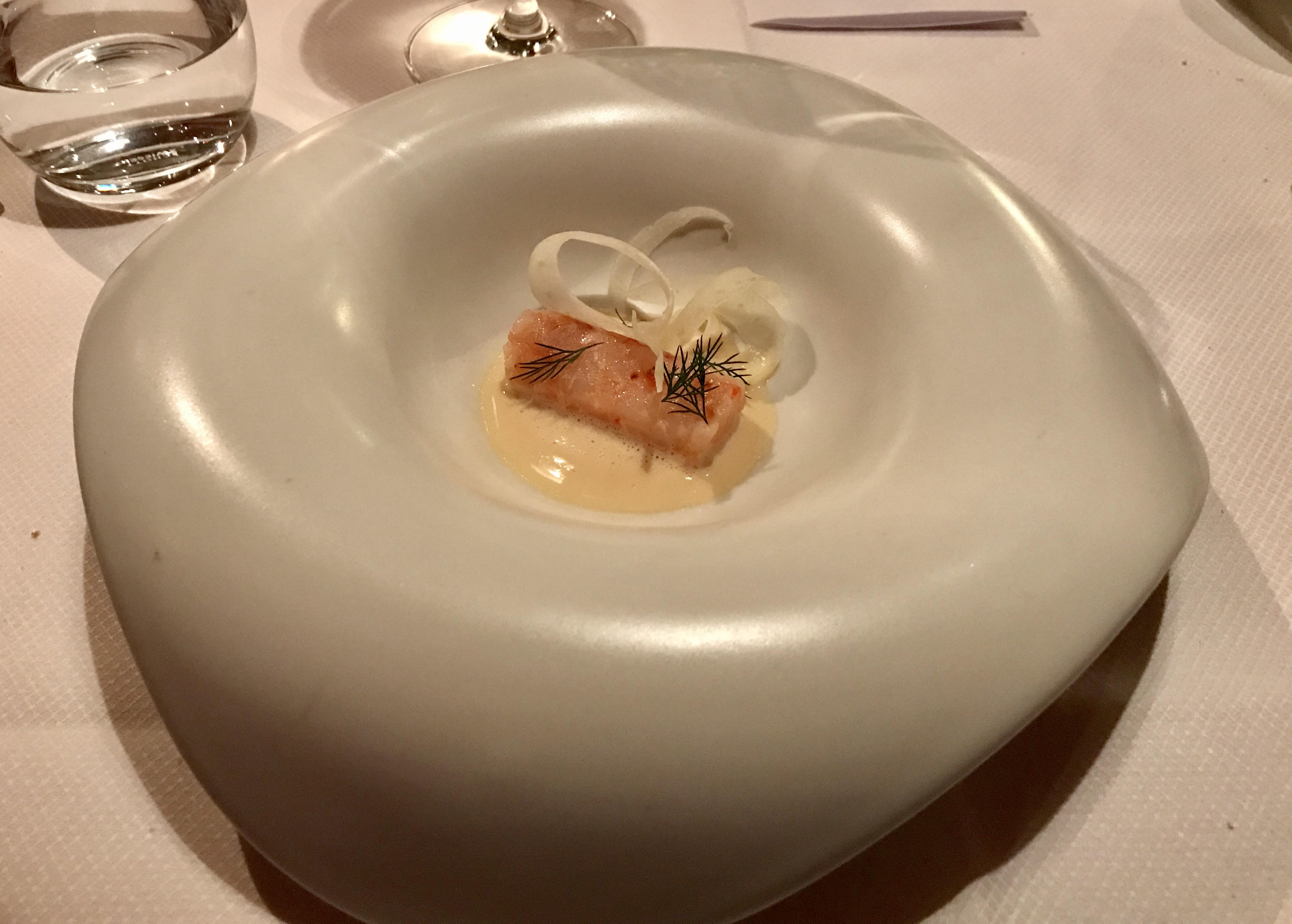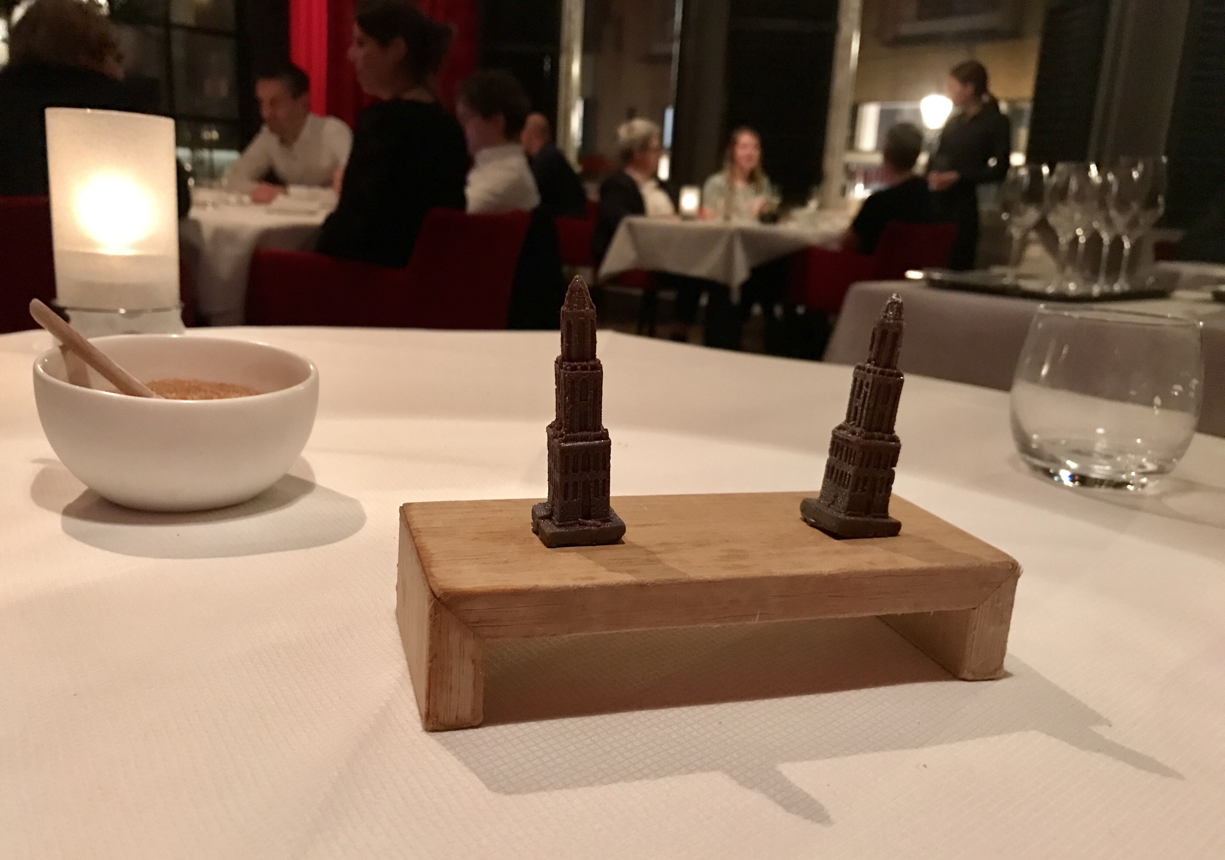 Podium onder de Dom is a restaurant in Utrecht (half an hour south-east of Amsterdam) that is located right under the city’s main landmark, the Dom (cathedral) tower. They do not have a Michelin star (yet) — but it seems that they are aiming to get one. Chef Leon Mazairac’s motto is “Simplicity is complex enough as it is”, and that is clear from the dishes in which the main ingredients are allowed to shine. The 7-course degustation menu (75 euros) changes regularly. (They call it 11 courses, but some of the parts are served together and it is not customary the count the amuses bouche and sweets with coffee as courses.) The “Winter Collection ’17” has the song “Oh oh Calypso Blues” as the theme, although apart from the one dish it didn’t become clear to us from the rest of the menu.