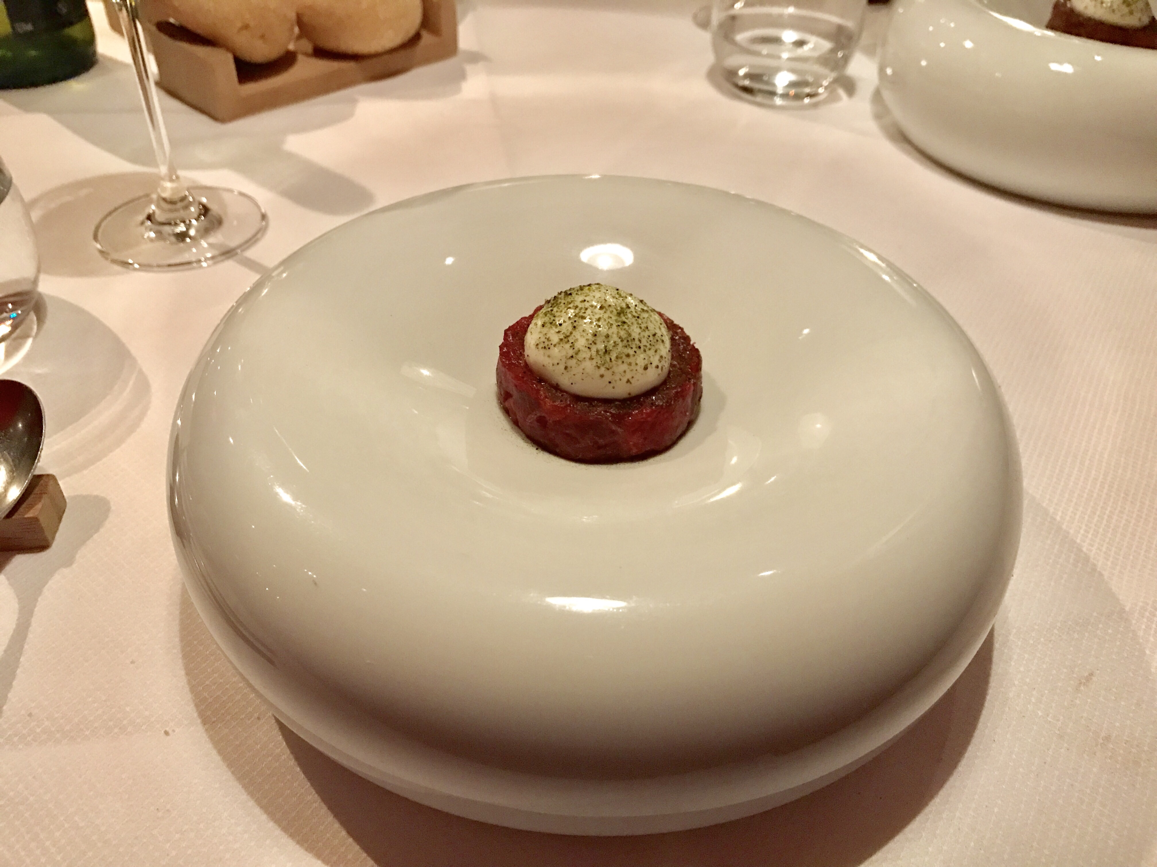 The following dish was the signature dish of the chef, a raviolo (singular) filled with oxtail confit, and a cream of mascarpone and old balsamico. We opted for a bonus of black truffle (12.50 euros extra). This worked well with a nice Pinot Noir from Valle de Uco, Argentina. A very nice dish, and I would not have minded ravioli (plural) instead of the one. 9/10