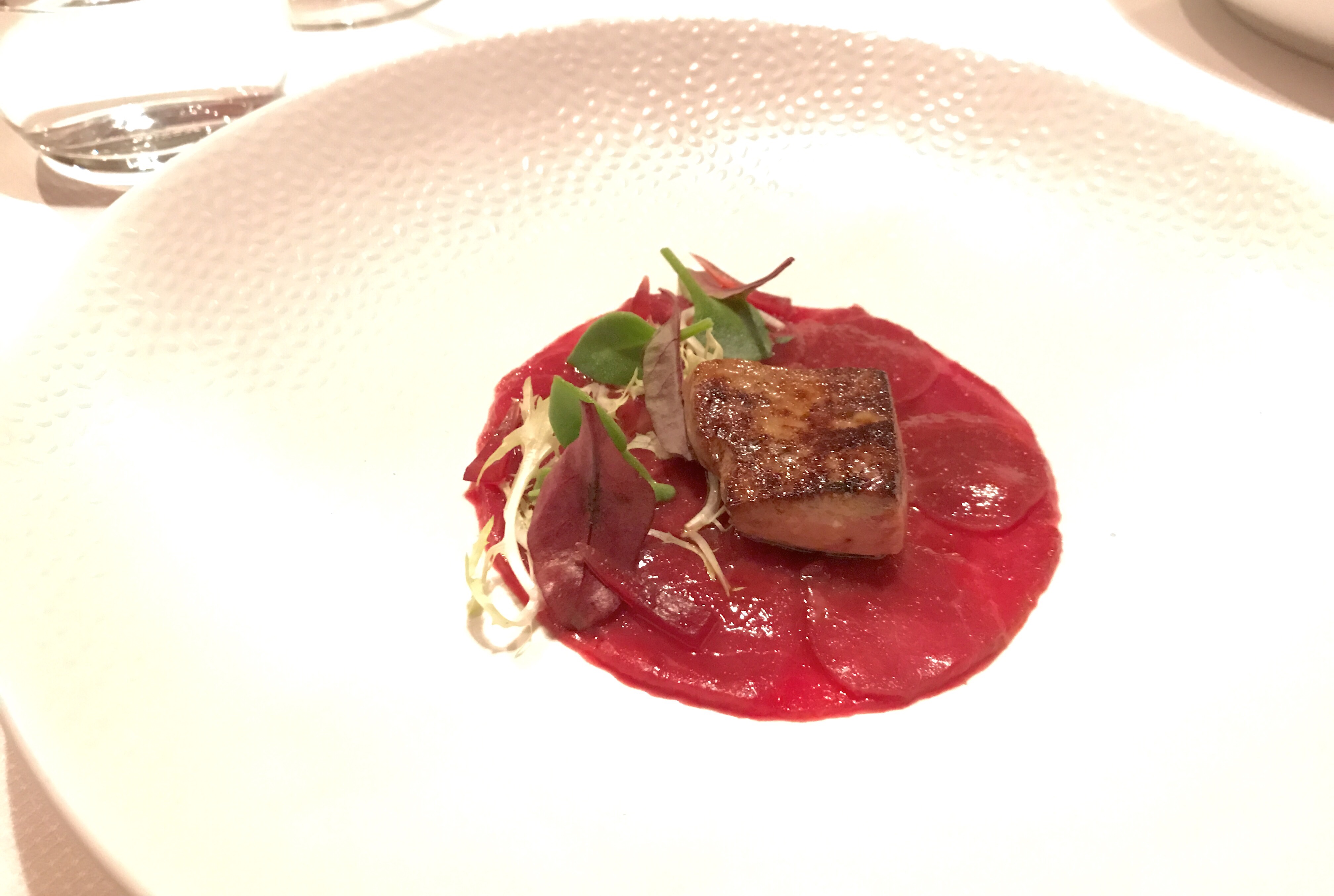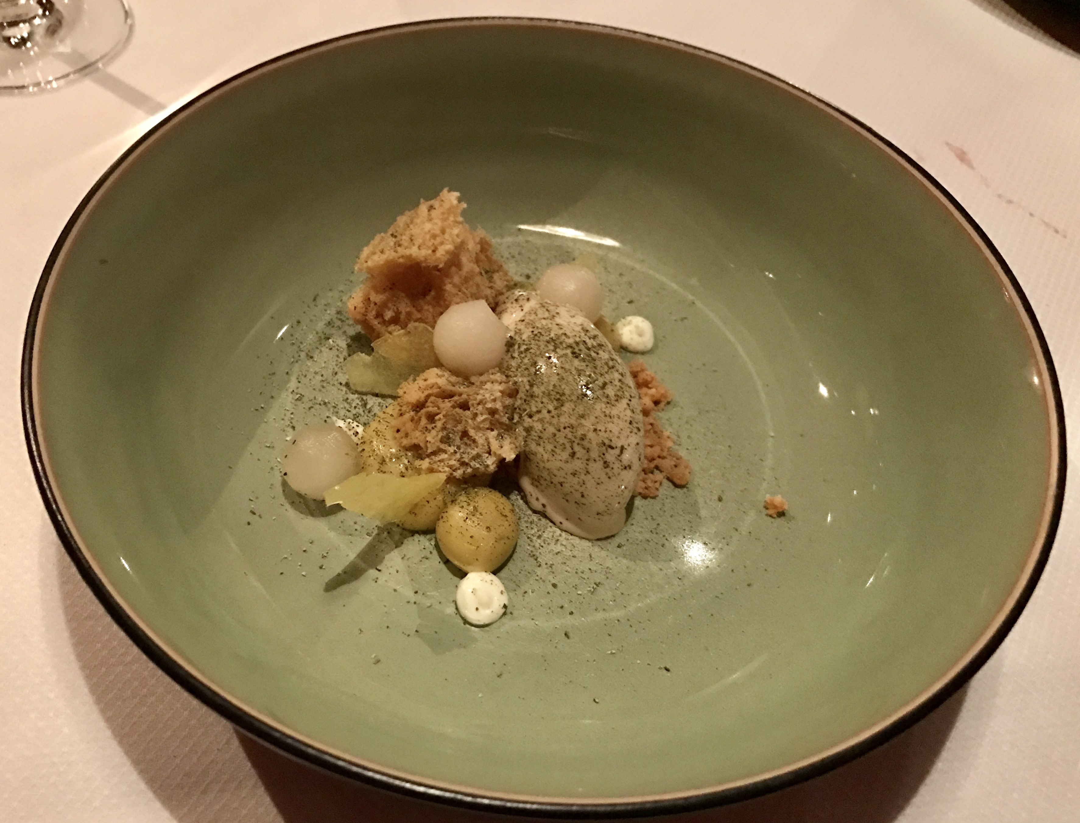 It also worked well with the first course: red mullet with sprouts and kimchi bisque. Although the “kimchi” was a bit hard to tell, this was delicious and a very good combination of flavors. The sprout leaves worked very well with the rest and the mullet was perfectly cooked. It also worked very well with the riesling. 9/10