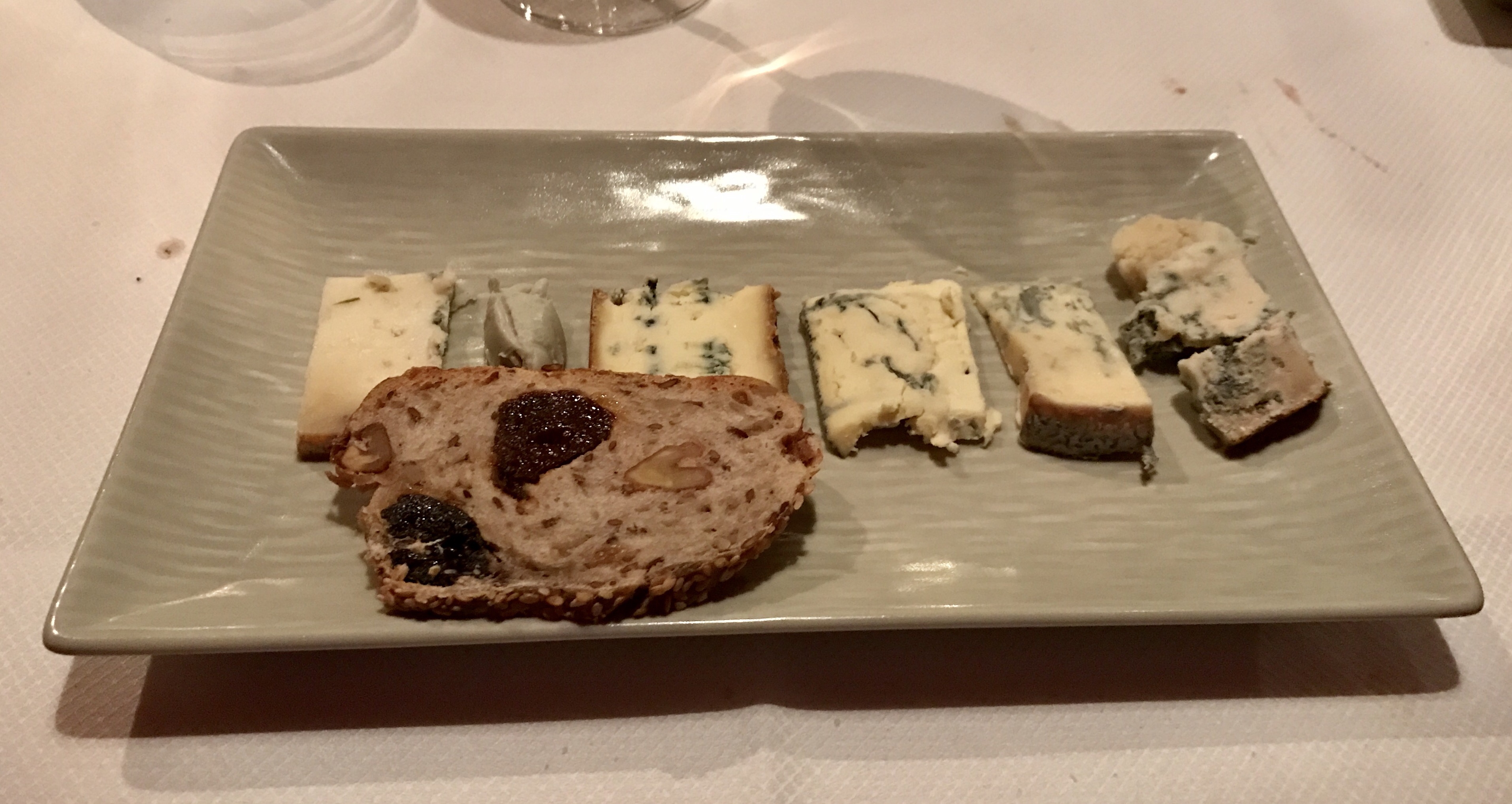 As the portions are very small, we opted to have cheese as an additional course (14 euros). There is a nice cheese cart with a good selection of cheeses, many off the beaten path. After some deliberation we asked for a selection of blue cheeses and a glass of Monbazillac.
