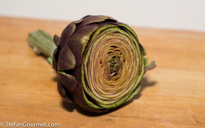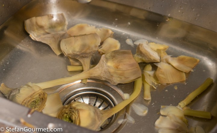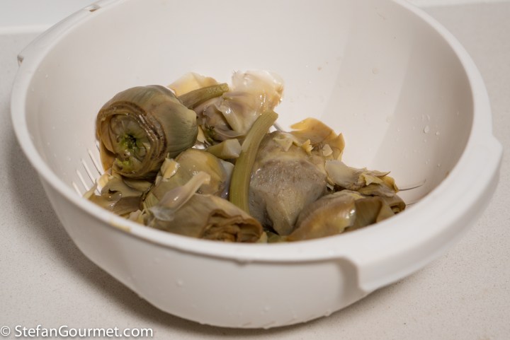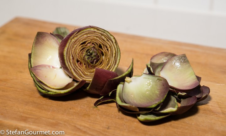 The nice thing about serving artichokes with a vinaigrette is that you can leave more leaves on them and scrape off the tender flesh with your teeth while eating. I don’t serve them like that for dinner parties though and Kees doesn’t like eating like that. So I end up with more elaborate preparations.