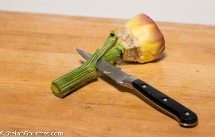 The main point about cleaning artichokes is that you should not be hesitant to be ruthless when cleaning them, as you have to remove all of the woody bits. They won’t soften if you cook them, so you just have to resign yourself to having a lot of waste. Start by cutting off the tip of the artichokes, about 2 cm (1 inch) from the top.