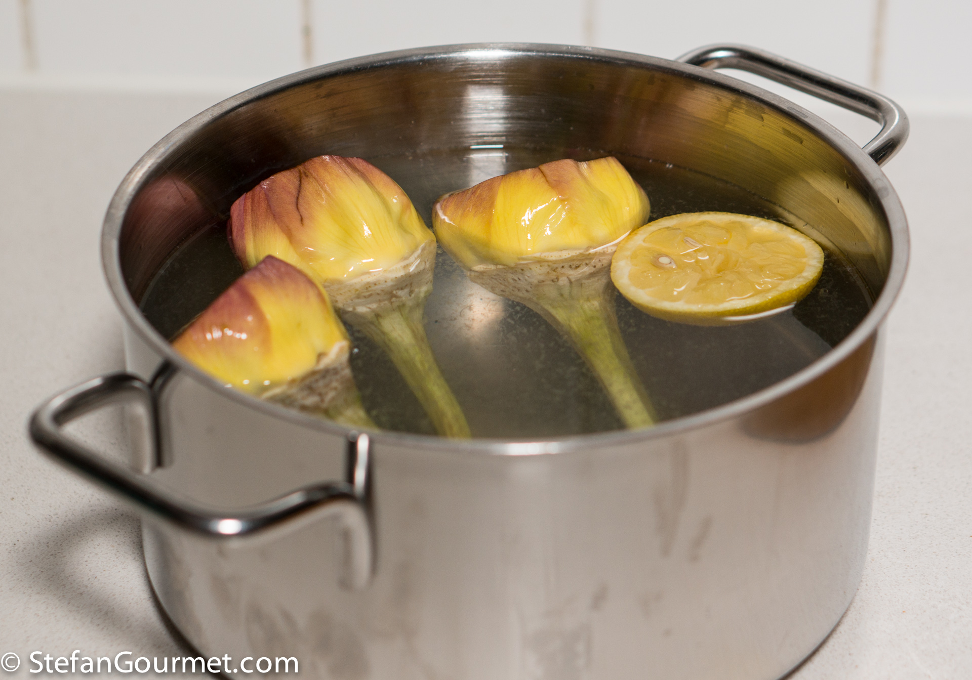 Put the artichokes in a pot or bowl of water with lemon juice to prevent discoloring while you clean the others.