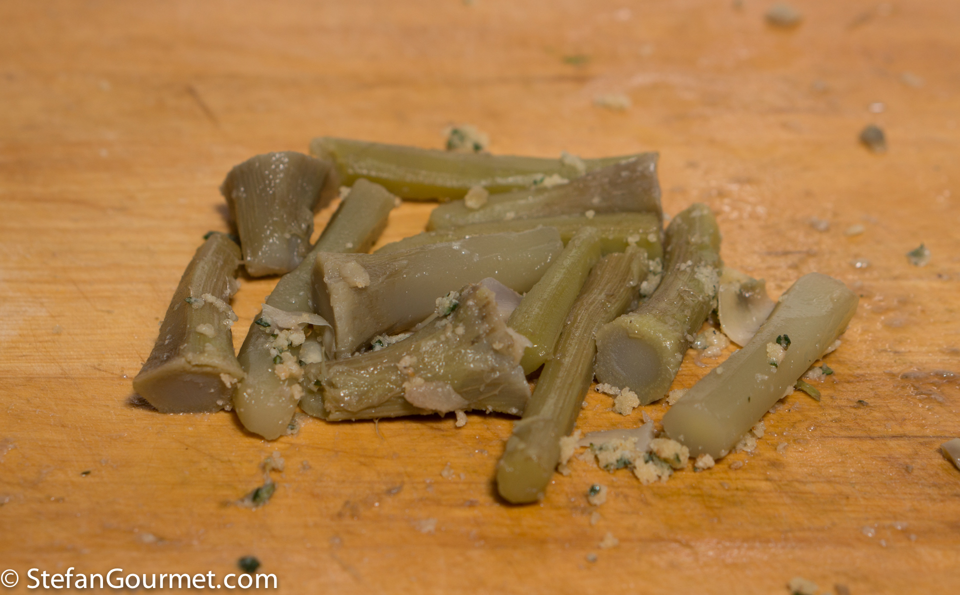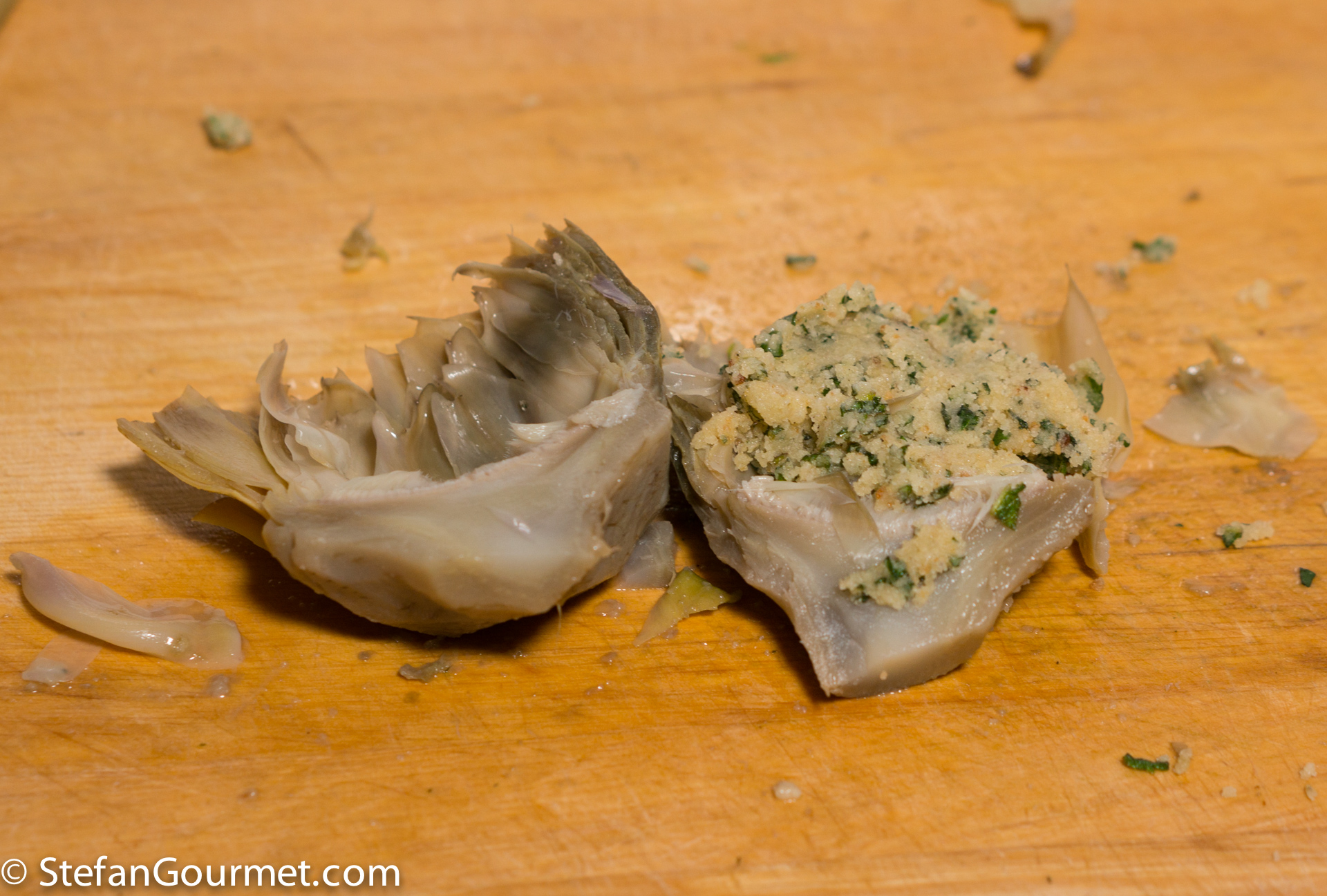 Cut the artichokes into halves. Remove any tough inner leaves or ‘hay’ that you will find inside. Then fill with the breadcrumb mixture. Reserve some of that mixture for the stems.