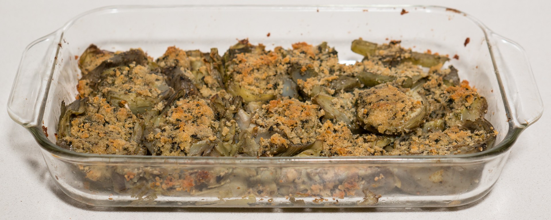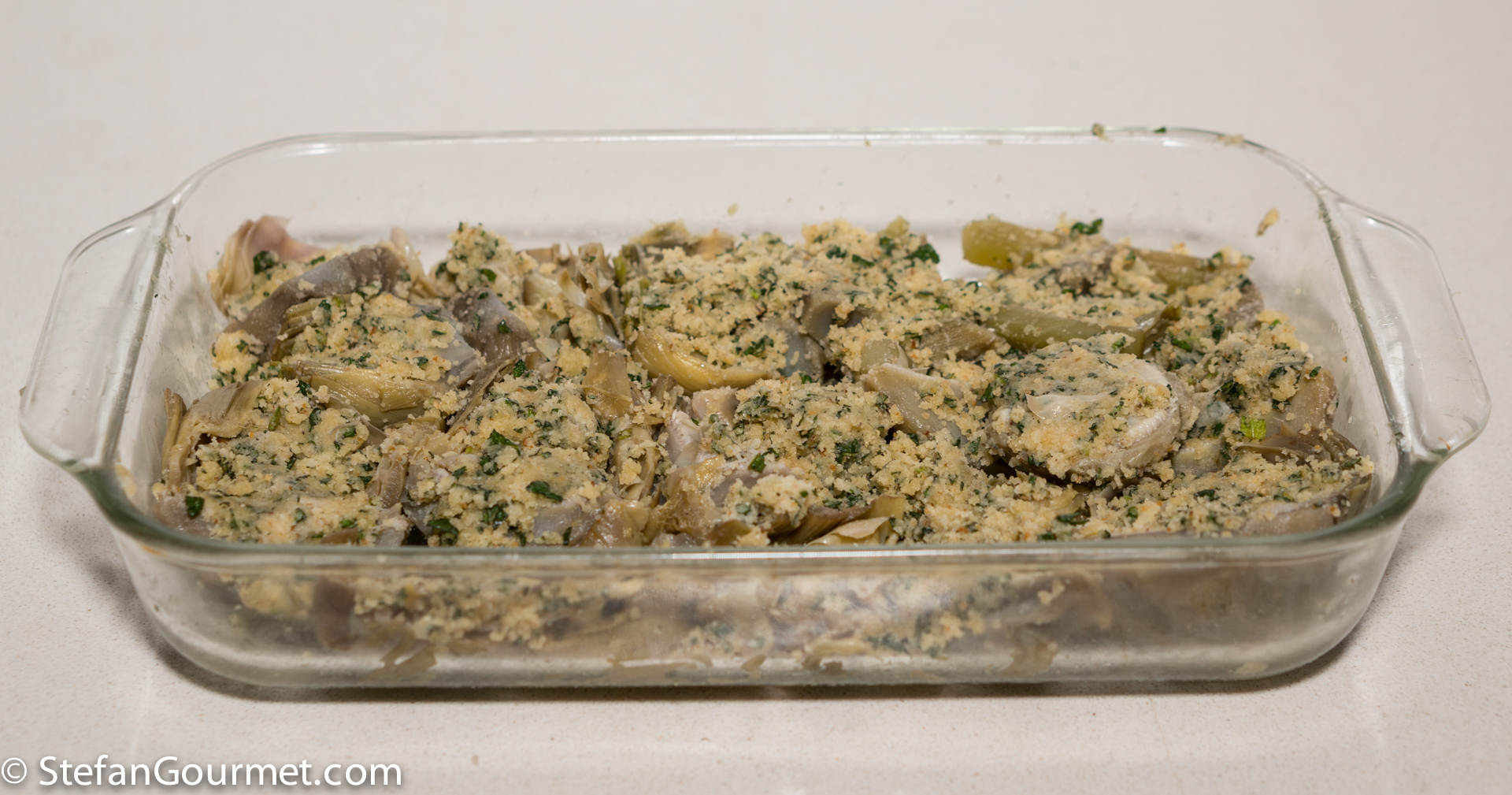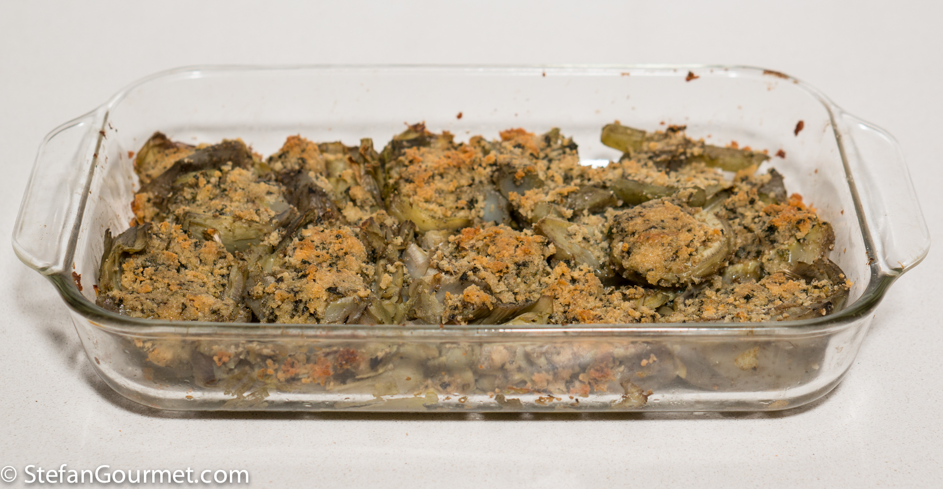 Lightly brush a wide oven proof dish with olive oil and arrange the artichokes in a single layer, filled side up. Crumble the remaining breadcrumb mixture on top of the stems.