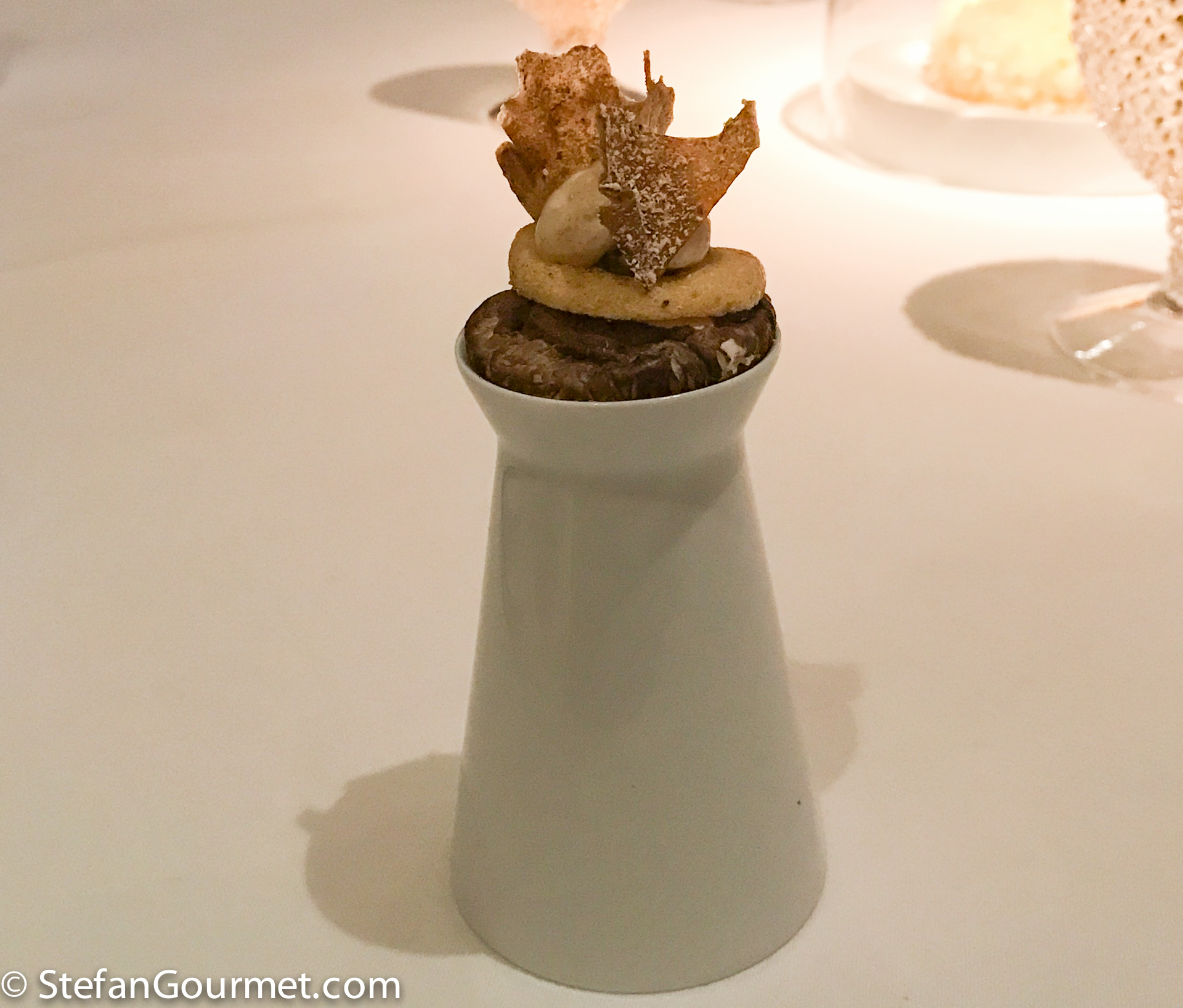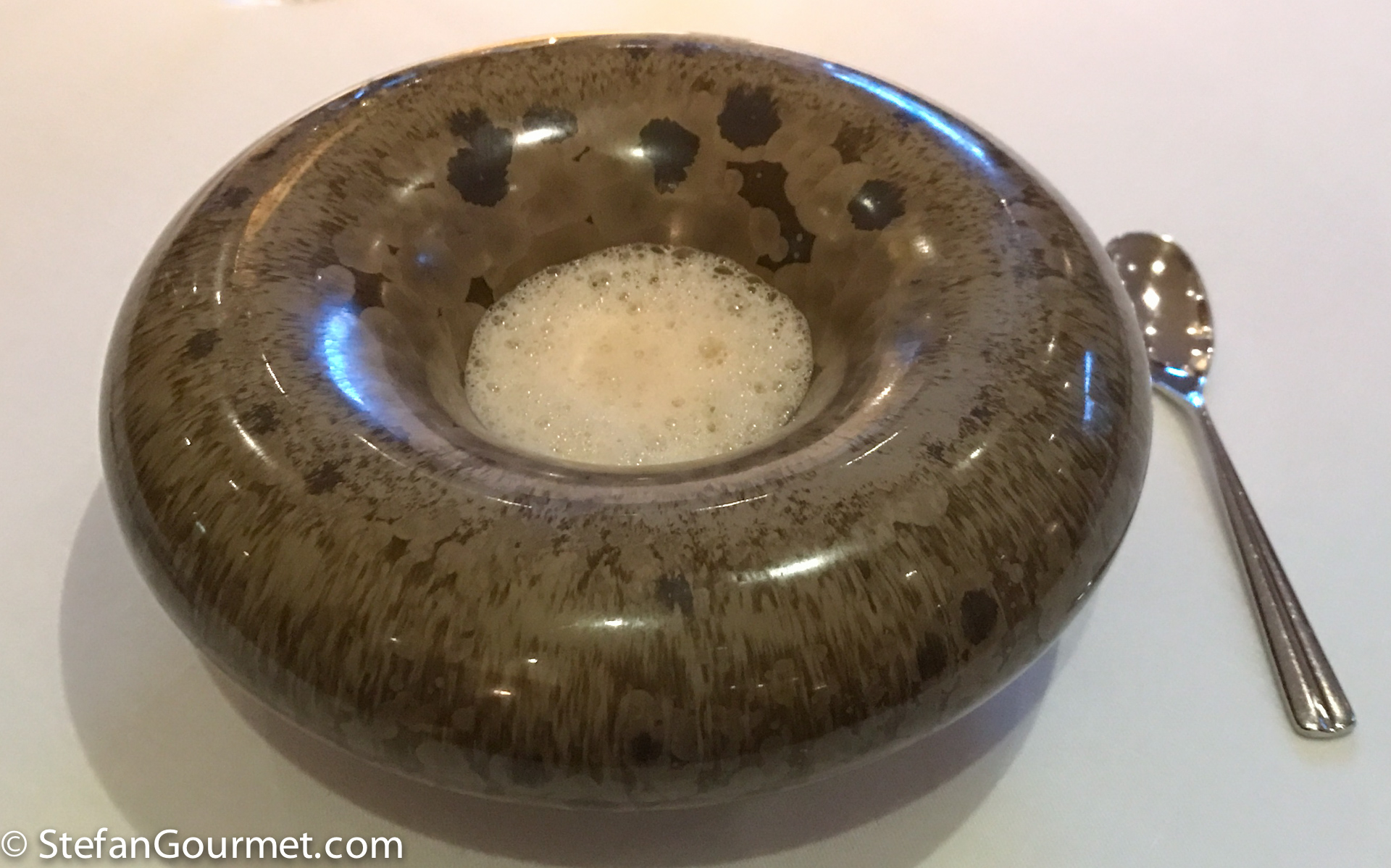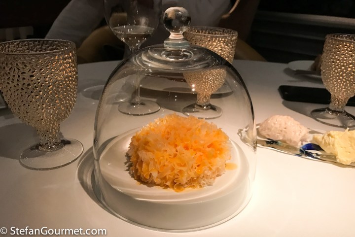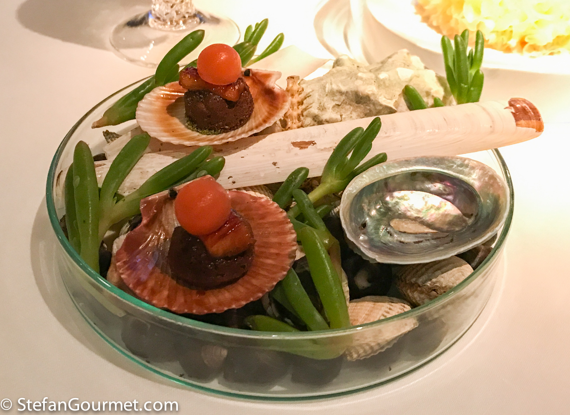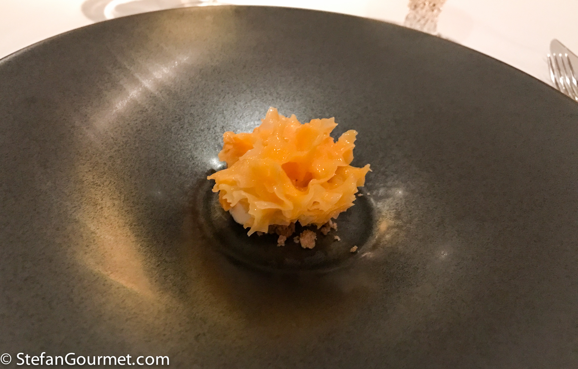 The object turned out to be Tremella, a Chinese type of mushroom, that didn’t have much flavor by itself, hence the buckthorn juice. It was served with orange blossom and caramelized butter. The accompanying late harvest Huxlrebe from Germany was very nice with it. 9/10