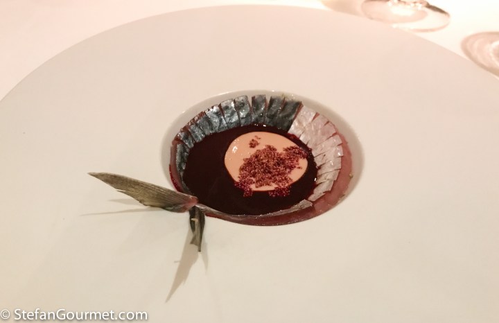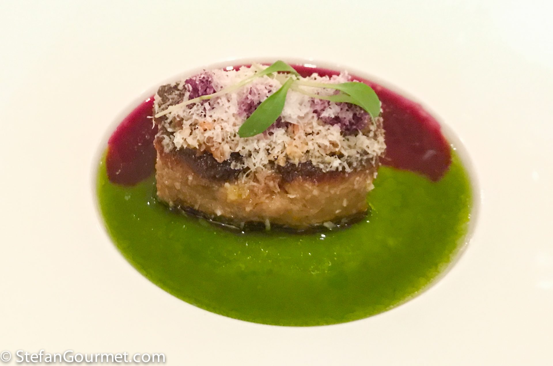 North Sea Crab and Veal Marrow, with grated veal tongue, cinnamon, oyster, and kaffir lime. Again an impressive dish with wonderful flavors, paired well with a Riesling from Waipara in New Zealand. 9/10