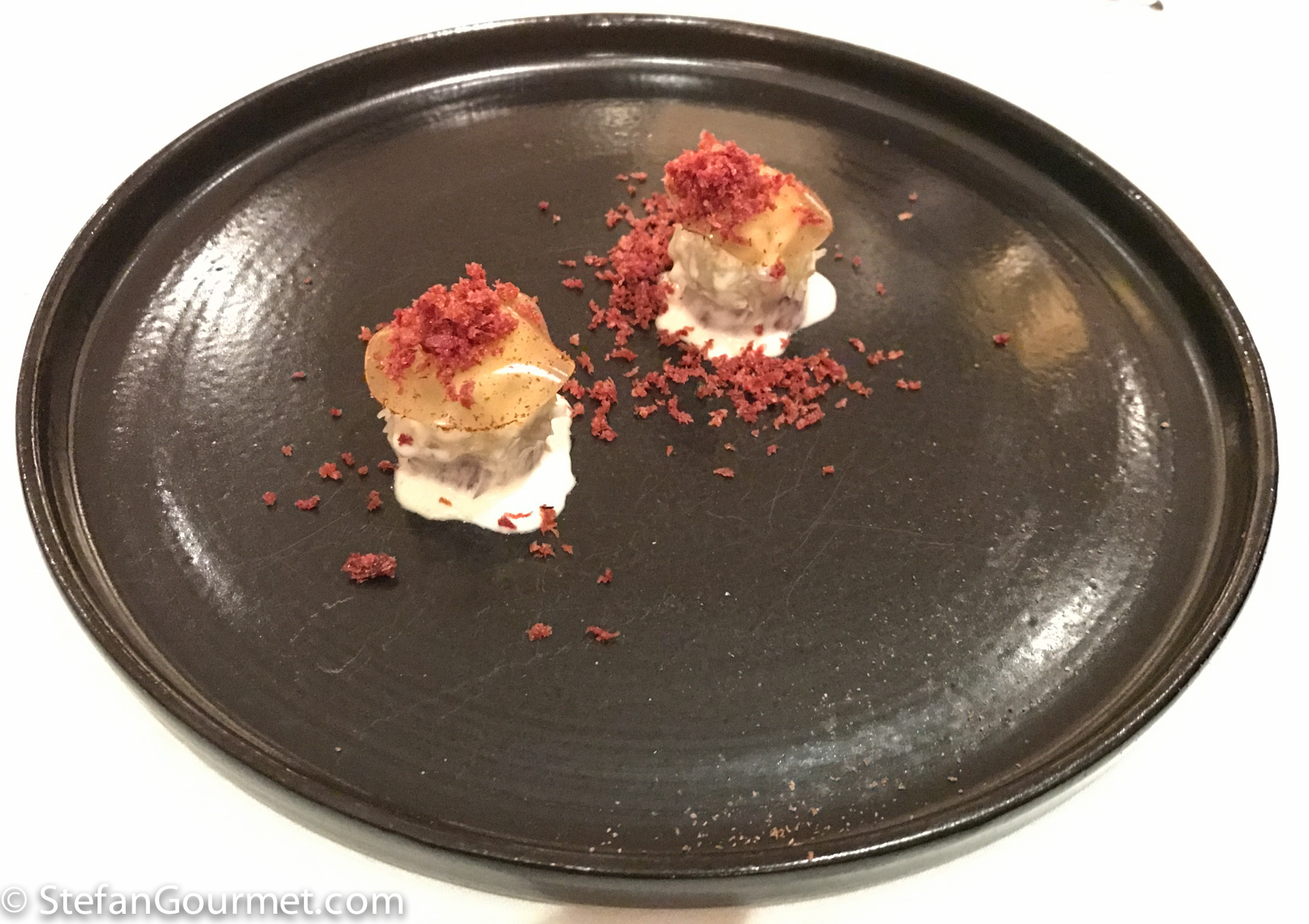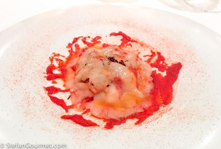 The second dish was perhaps the best dish of the evening, but certainly not the most photogenic. Raw carbinero prawn on crispy strands of short rib (‘pulled’ short ribs, then deep fried) with roasted bell pepper, ginger, water melon, and X.O. cream. Wow. What a wonderful combination of flavors and textures. The short rib strands looked like (but of course did not taste like) threads of saffron. There is a lot of going on here with the ginger, bell pepper, and water melon, but every part played its role and it was simply wonderful with the creamy, again impeccably fresh, prawn. Of course there was also pimentón (paprika) sprinkled on the plate, to make it even more Spanish. This was paired with a blend of Weissburgunder, Sauvignon Blanc and Sipon (Furmint) from Slovenia. A complex wine that worked wonders with this complex dish. It was interesting to note that the wine had some ‘petrol’ going on, which is more usual for Riesling from Alsace or Germany. 10/10