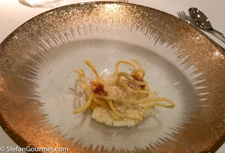 The final course of the menu was a desert version of spaghetti carbonara: crispy spaghetti served with egg yolk ice cream, crispy pancetta, pecorino cheese, and freshly ground black pepper. This was outstanding with a late harvest Tokaji. 10/10