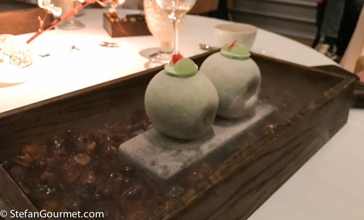 And finally, a green apple martini, served on a green apple that had been frozen with liquid nitrogen. (You couldn’t eat the apple, just the martini on top.)