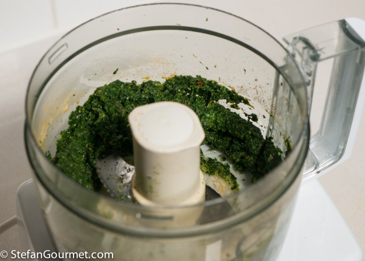 Put the spinach in the food processor together with the toasted cumin seeds, 2 Tbsp chickpea flour, 1/2 tsp red chilli flakes, 1/2 tsp ground turmeric, 1/2 tsp freshly ground black pepper, and salt to taste (I used 3/8 tsp).