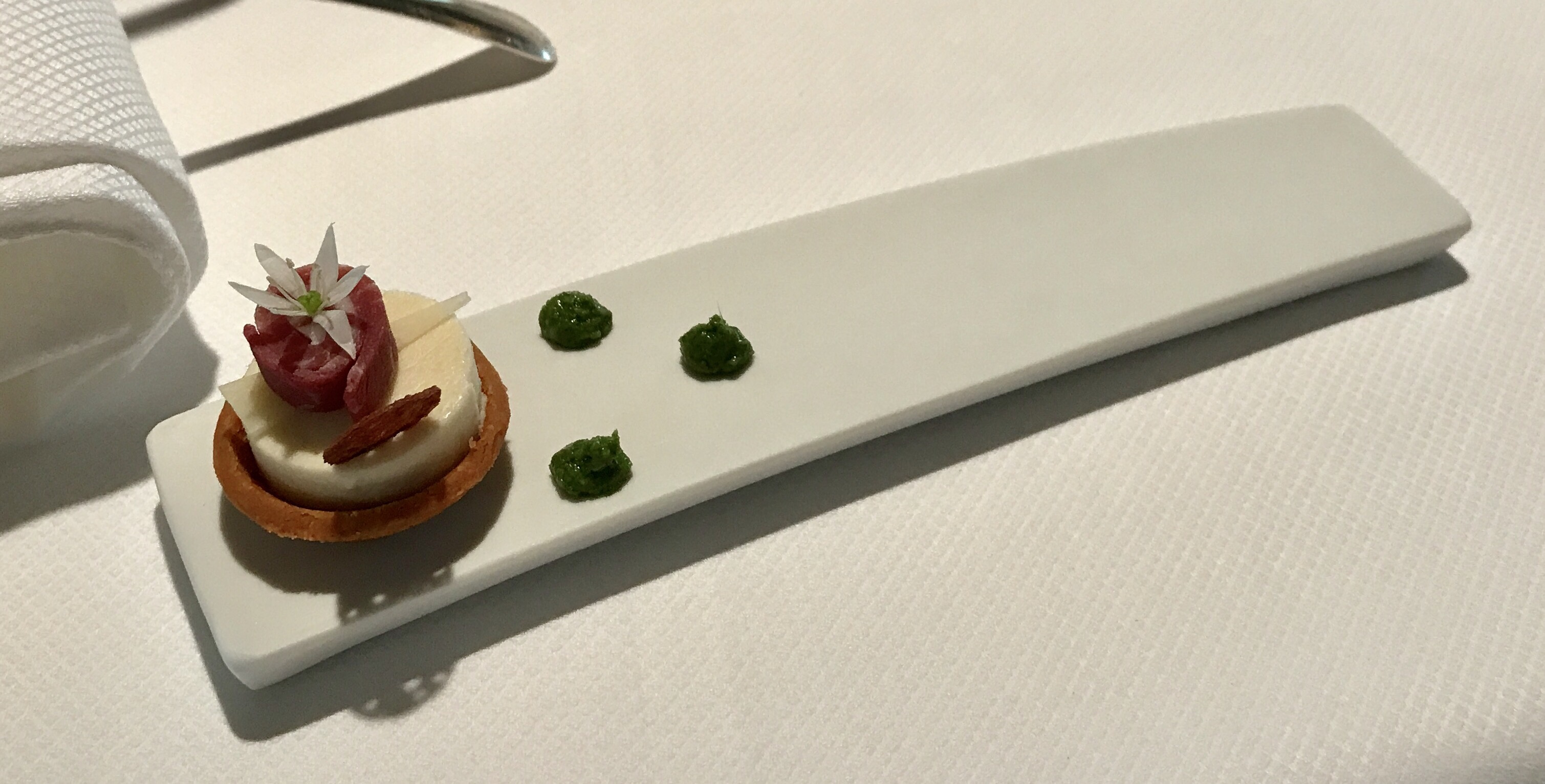 The first amuse bouche: parmesan tartlet with pesto.