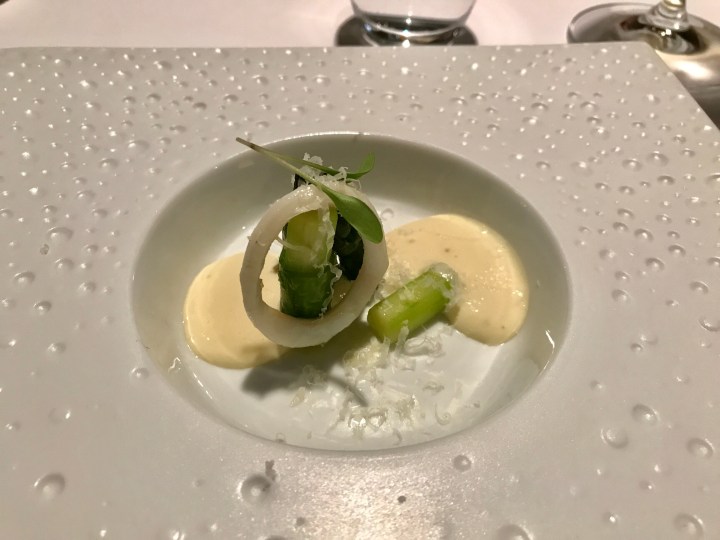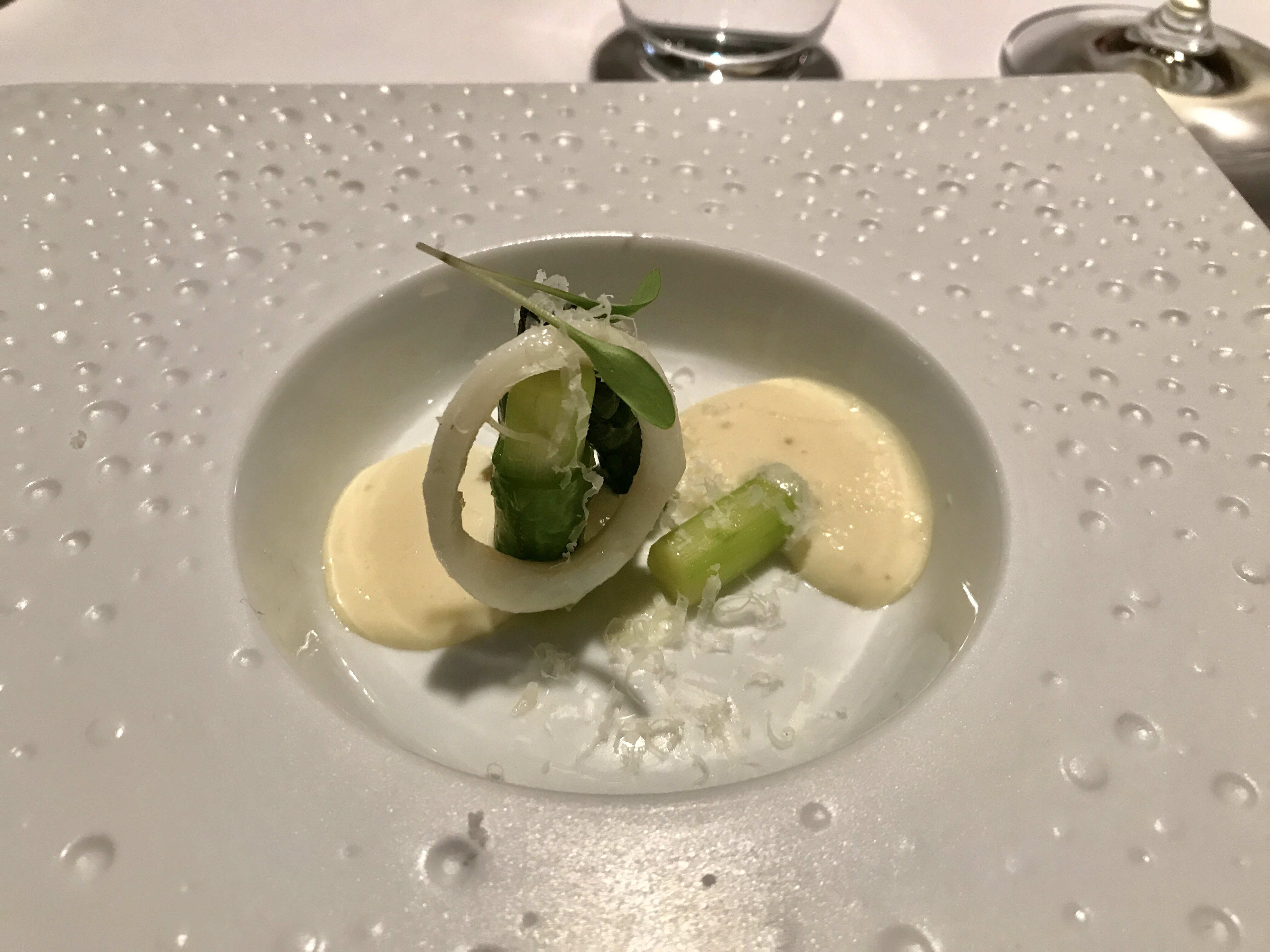 The first dish: green asparagus with calamari and a creamy sauce, sprinkled with parmigiano. The calamari was very tender and was very nicely seasoned. 8/10
