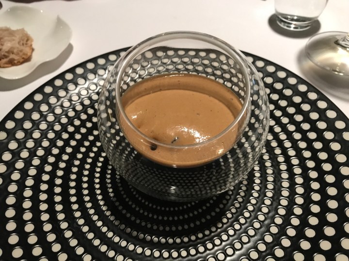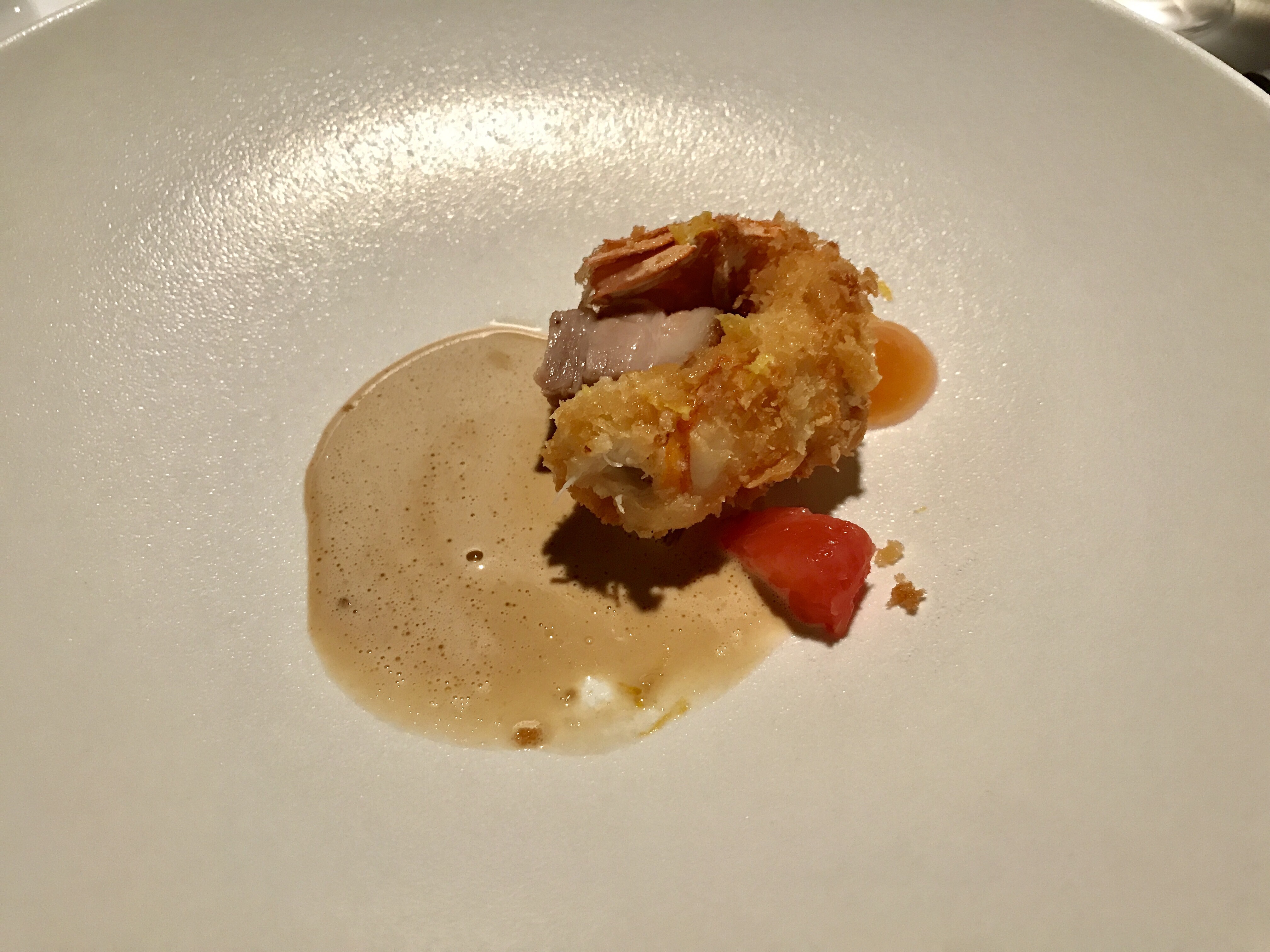 Crunchy langoustine with pork ‘poitrine’ confit, citrus, and langoustine jus. Another very good dish. The langoustine was very crispy and worked very well with the pork and citrus. The jus had great depth of flavor with a touch of citrus. 9/10